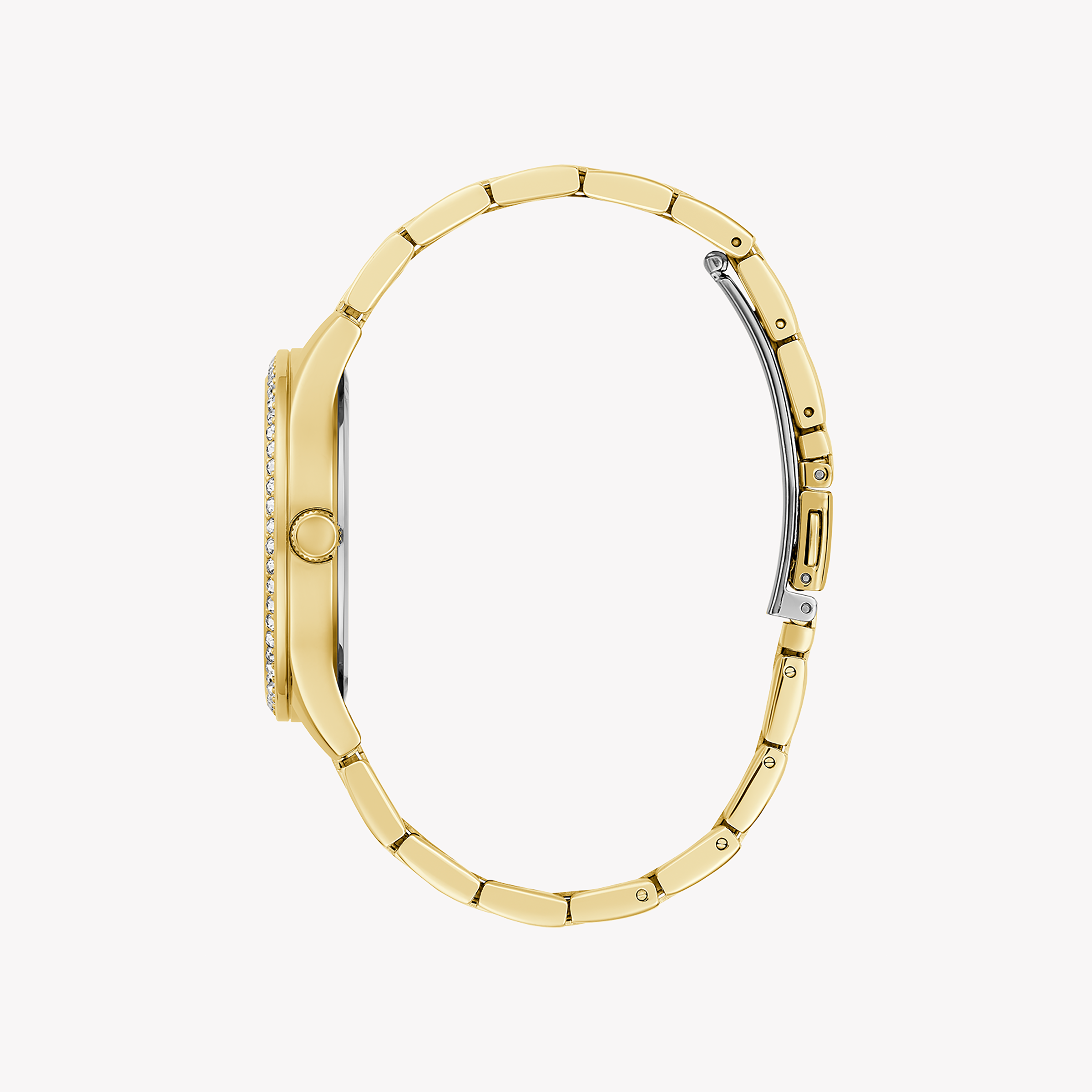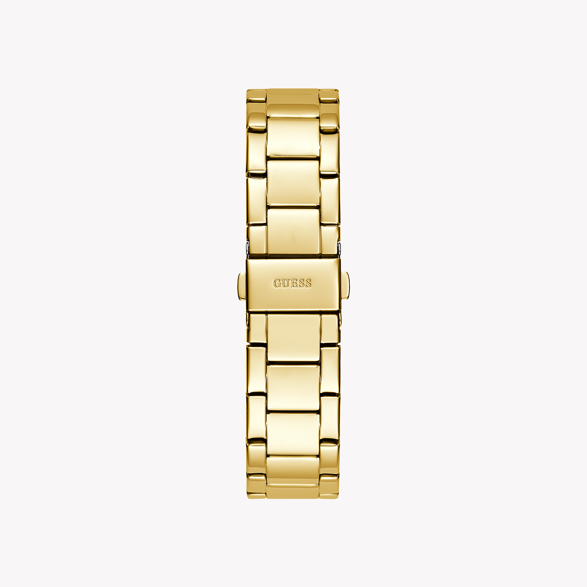 Make a bold statement with the GUESS GW0605L2, an elegant women's watch featuring a stunning gold stainless steel case and band. Its radiant gold dial and precise quartz movement blend style and functionality for every occasion. Shine effortlessly!