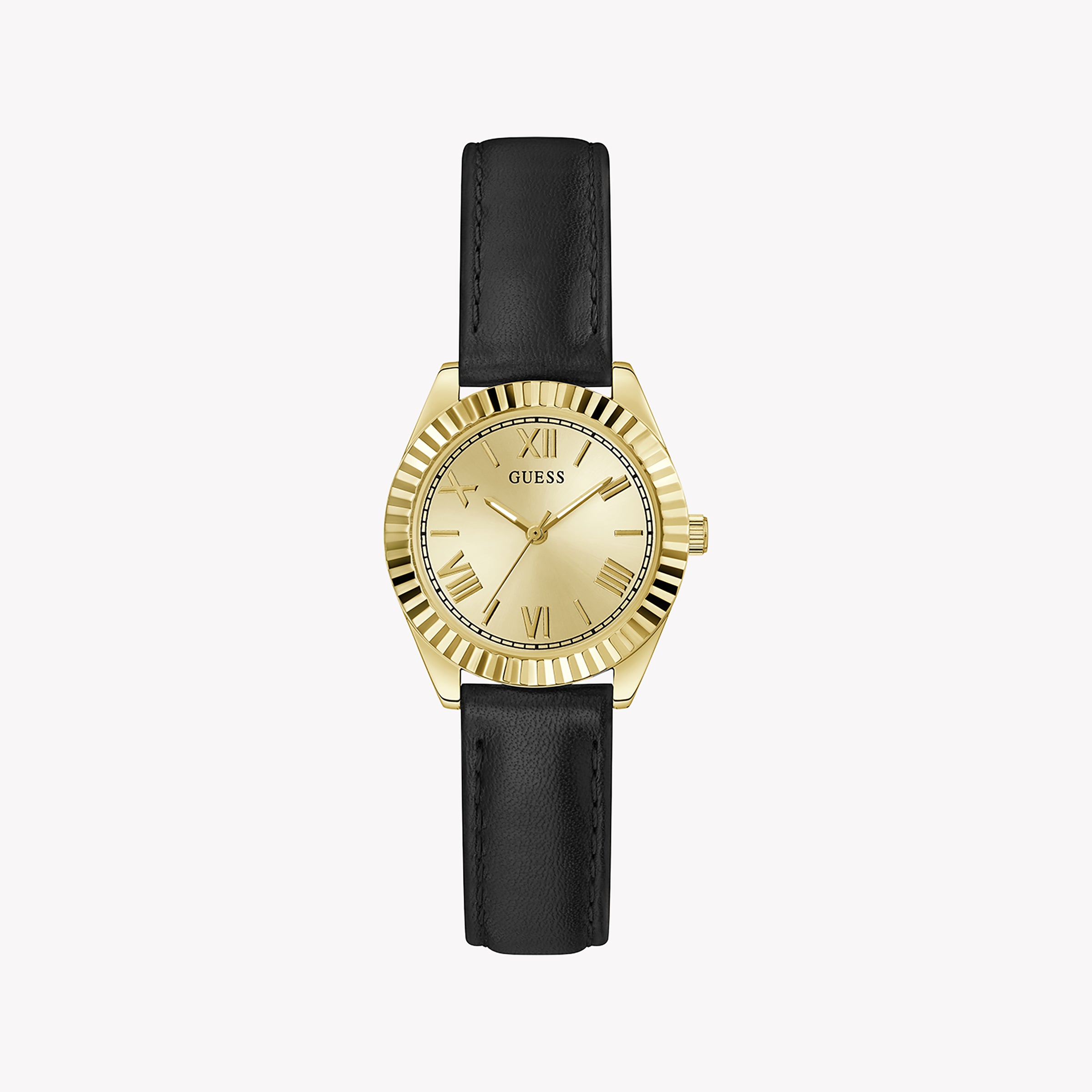 ساعة GUESS GW0761L1 - ELEGANT CHARM SERIES للنساء مع هيكل ذهبي ومينا بلون الشمبانيا وسوار جلدي أسود