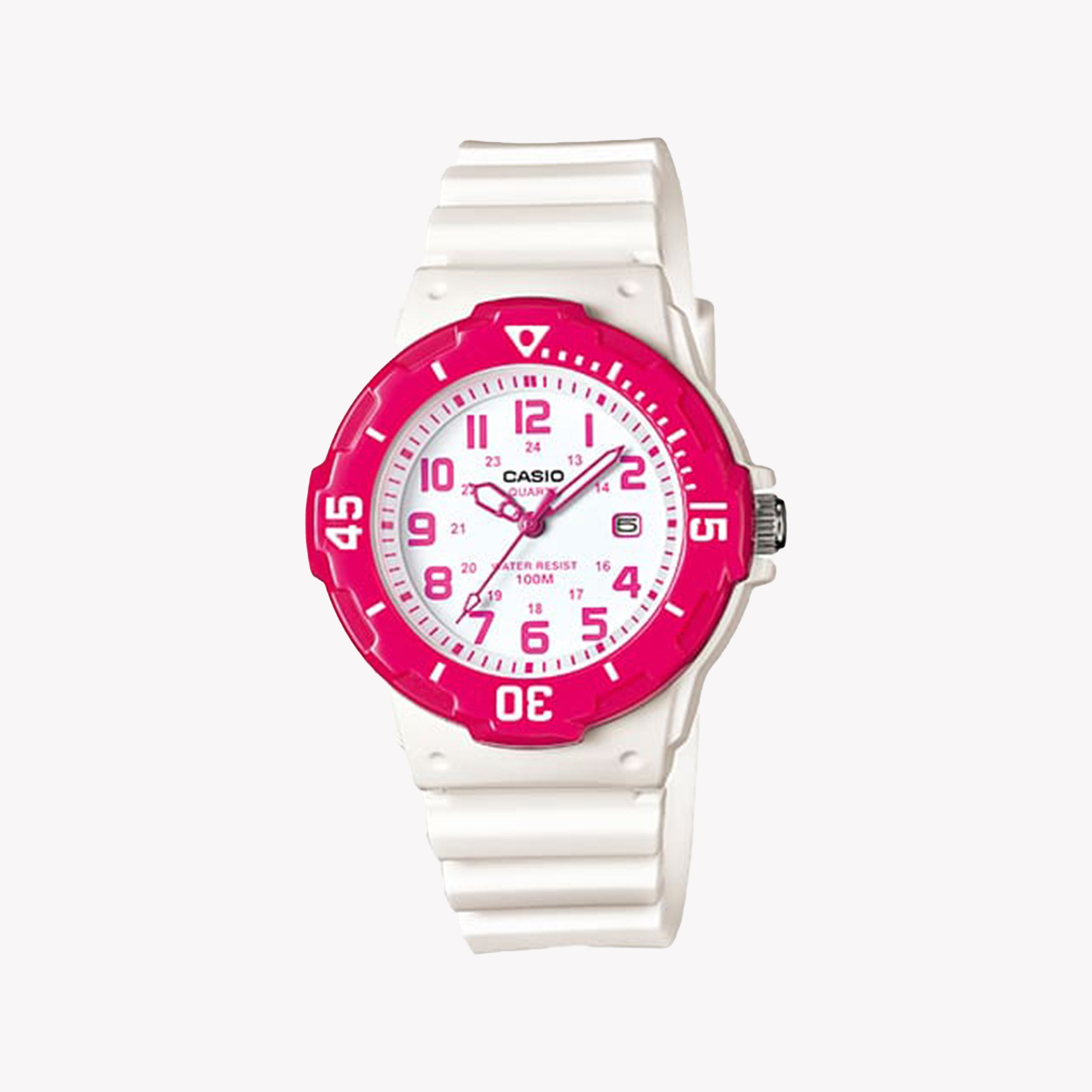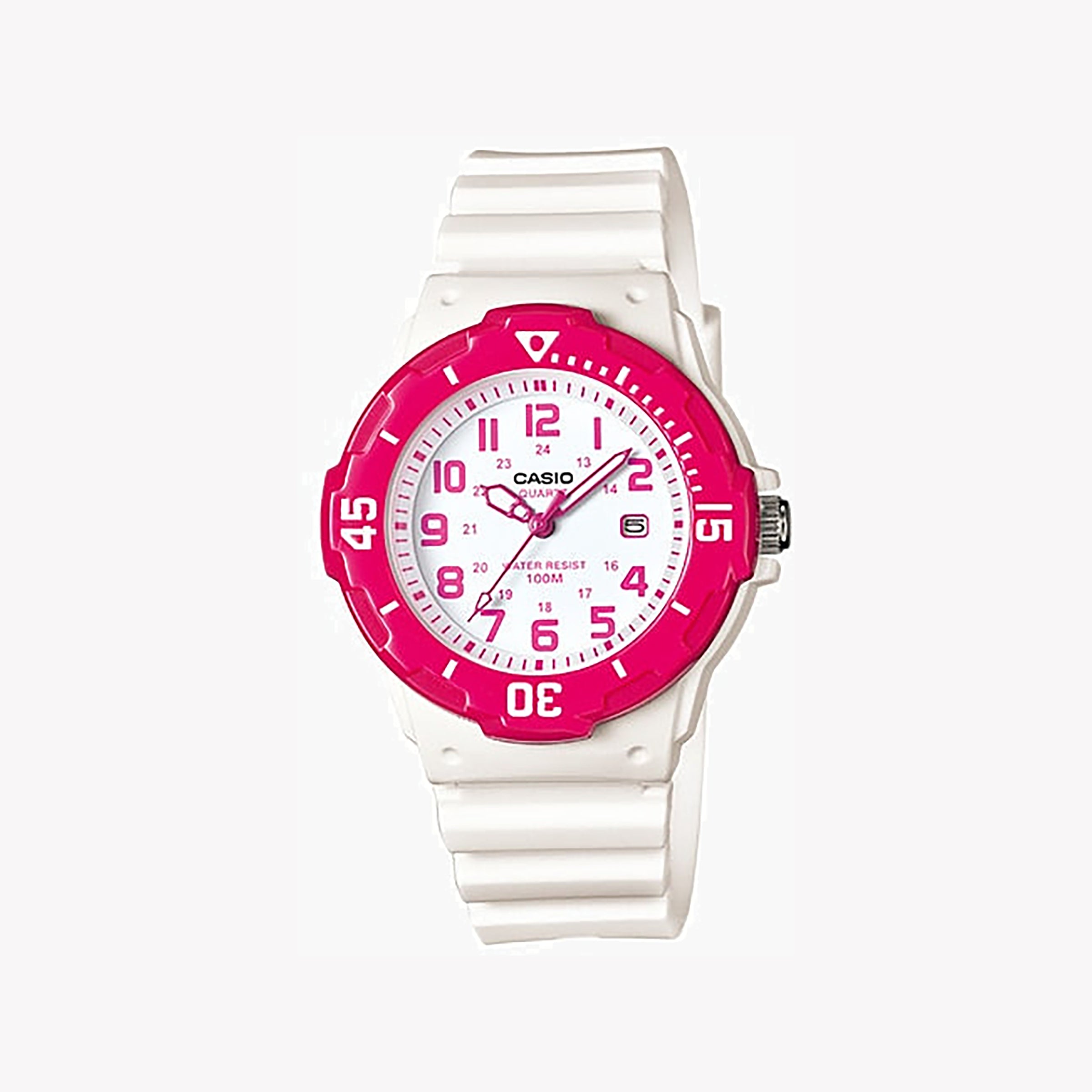 Unleash adventure with the Casio LRW-200H-4BVDF women's watch. Stylish white resin design, accurate ±20 seconds/month, 100m water resistance, and versatile features.