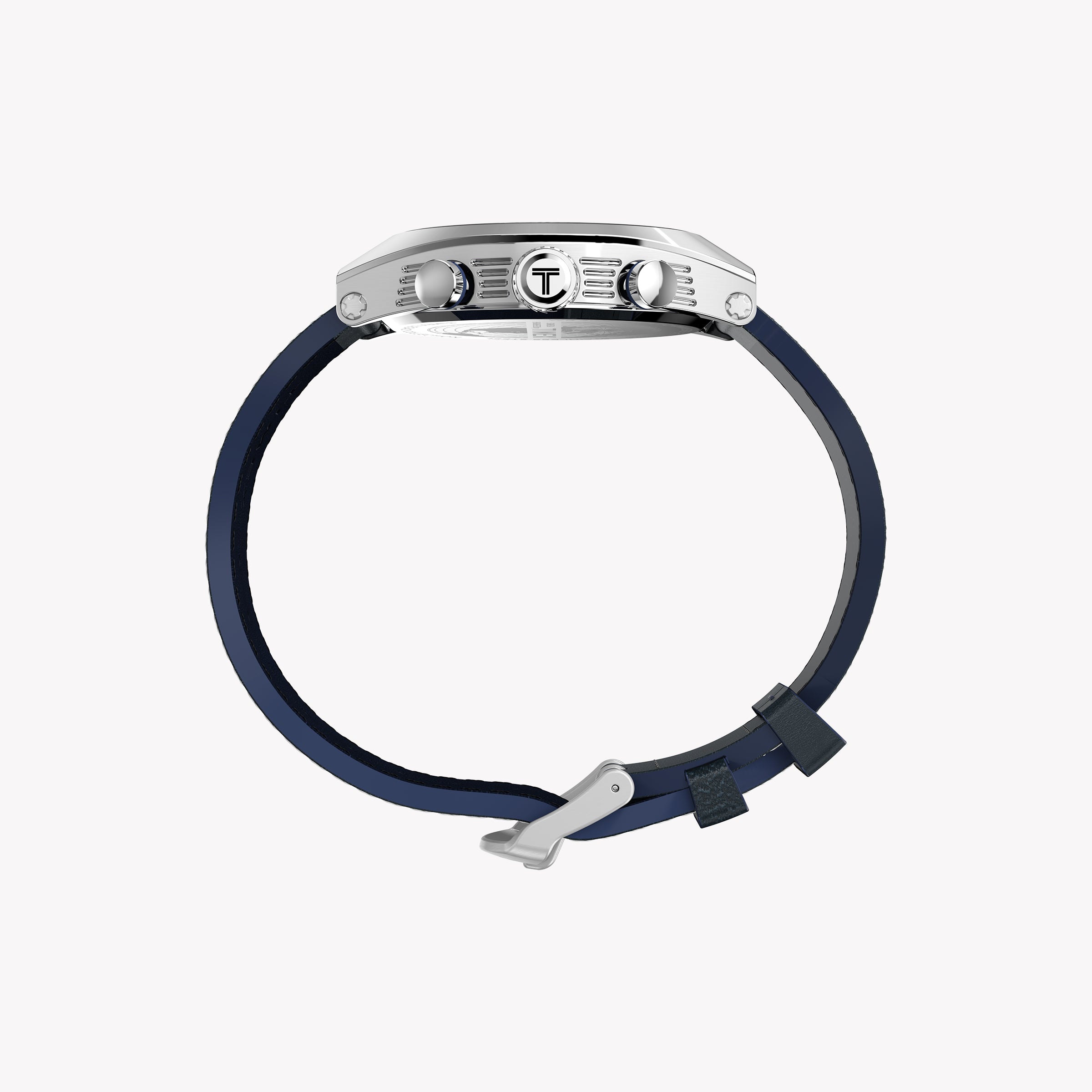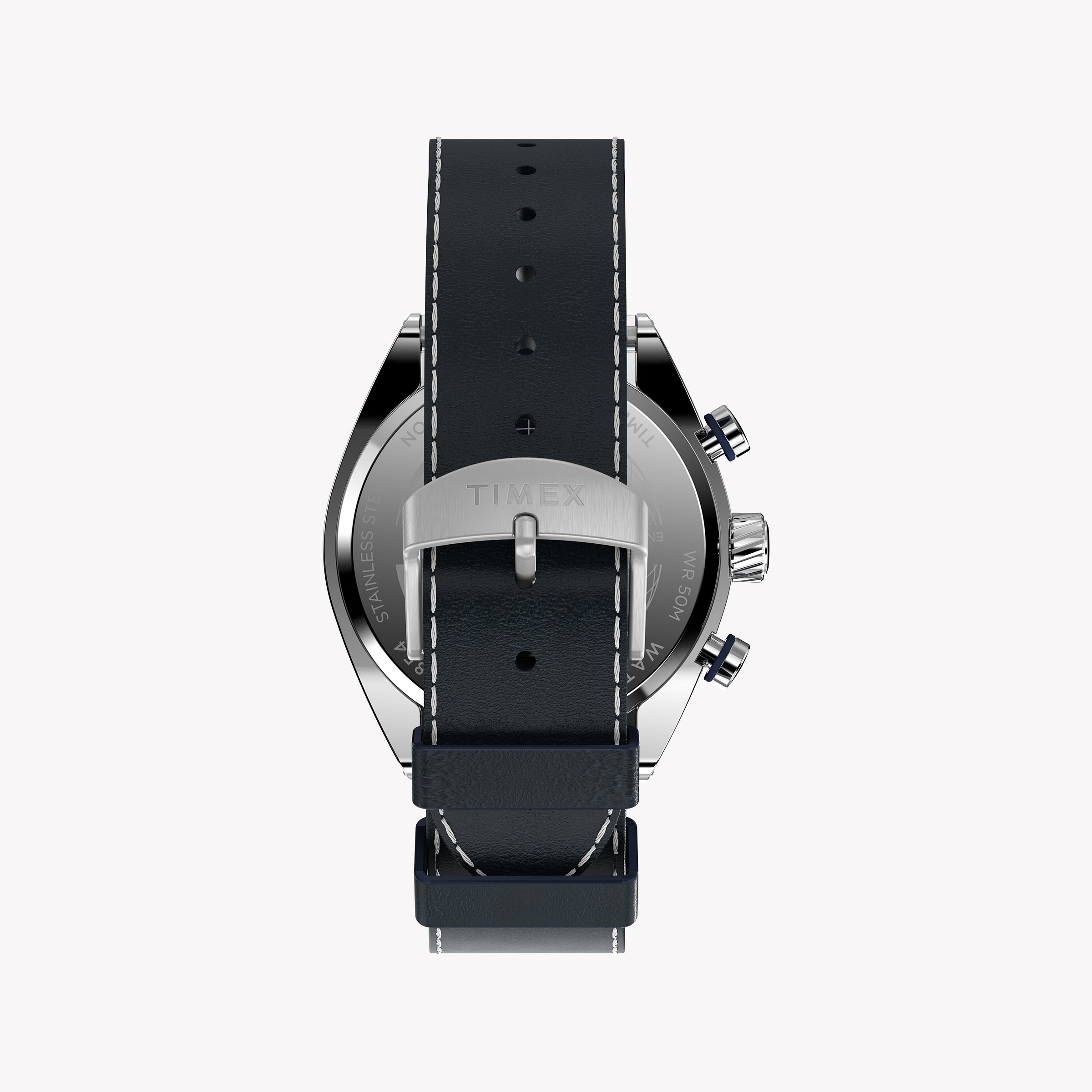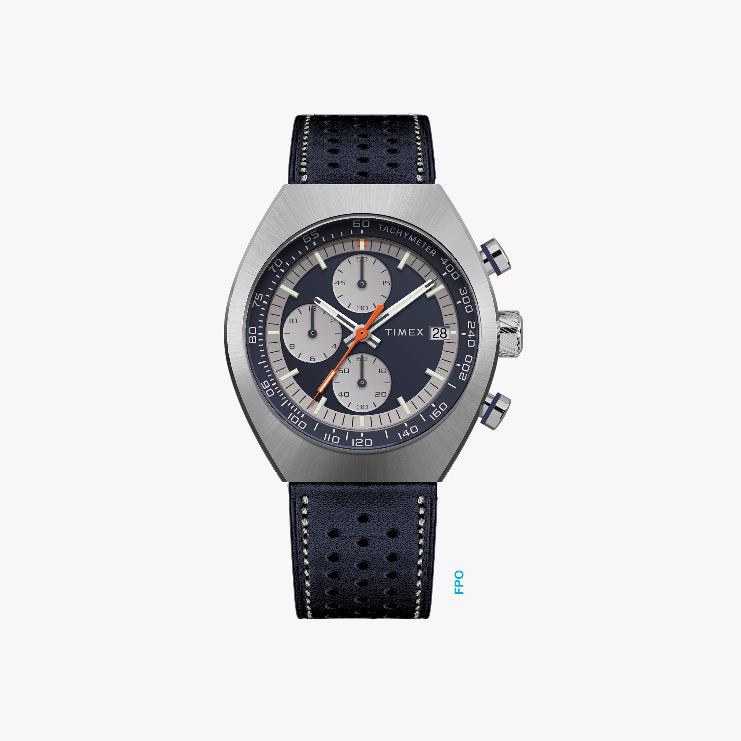 Timex Legacy Tonneau Chronograph with a 42mm recycled stainless-steel case, multi-layered dial, tachymeter, colored hands, and sport-inspired leather strap.