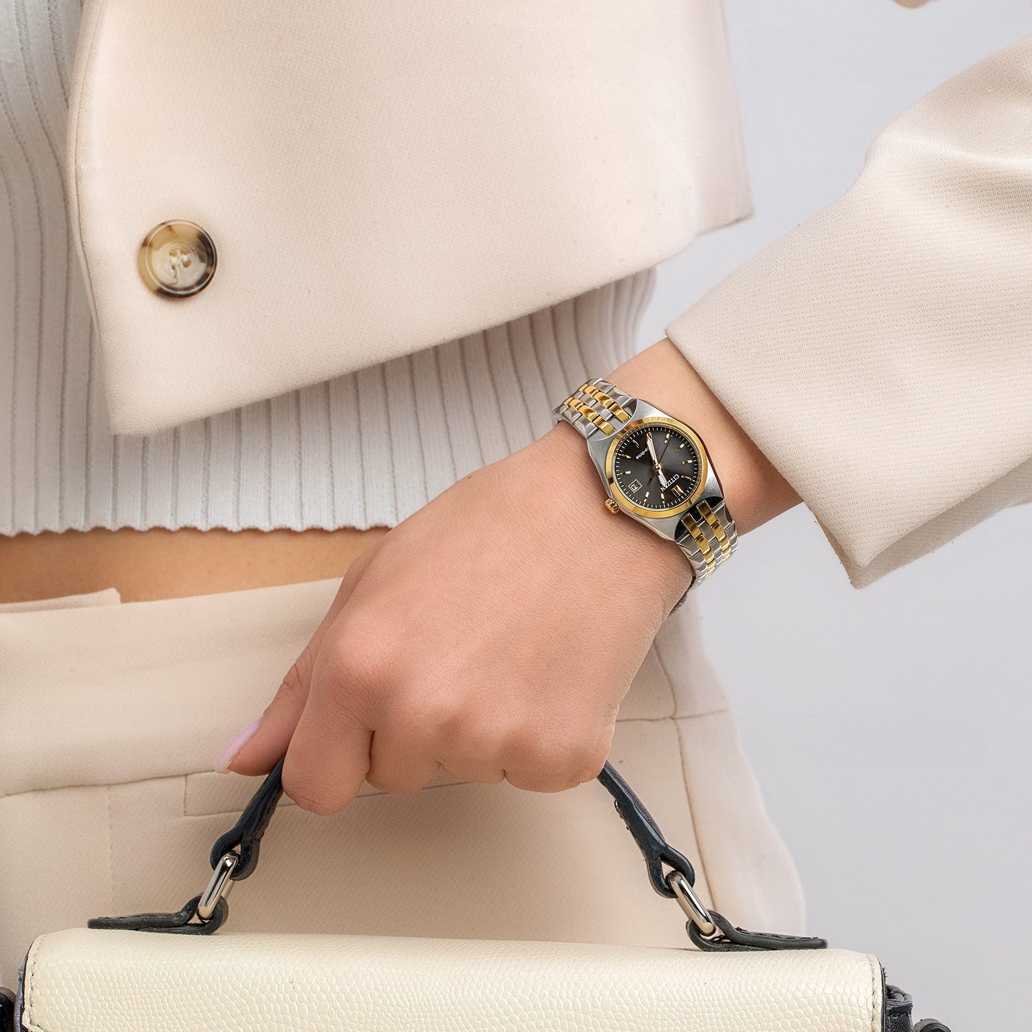 - مظهر م striking: صُنعت علبة الساعة من الفولاذ المقاوم للصدأ بقطر 28 مم، مكتملة بلون ذهبي مشع، لتخلق مظهراً رائعاً، بينما تضيف الساعة ذات القرص الأسود تبايناً جريئاً يجذب العين.