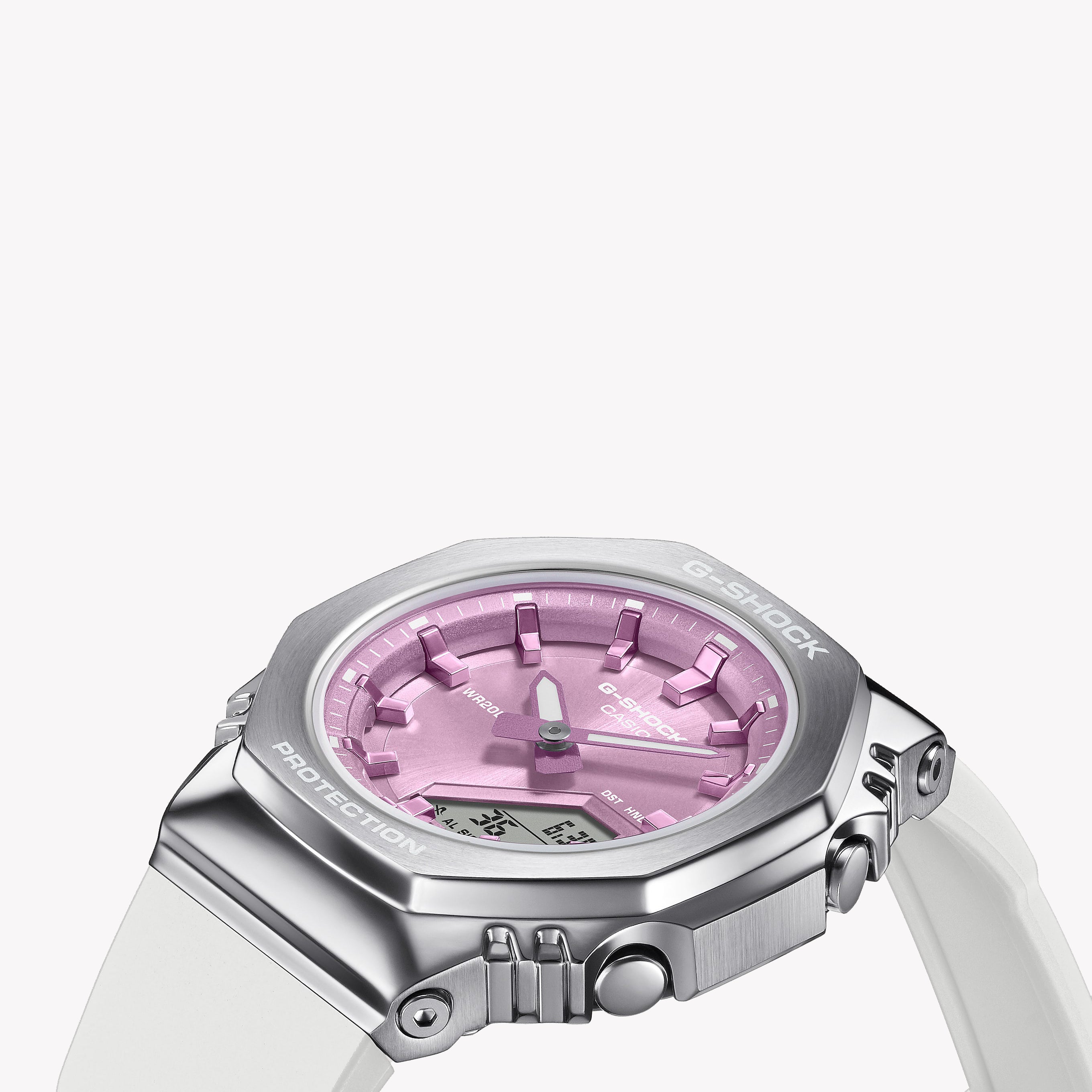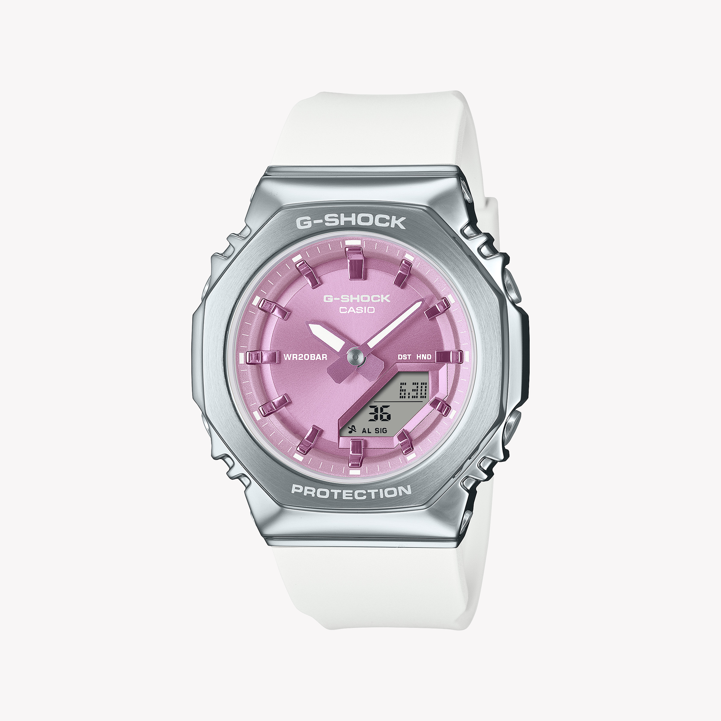 Make a bold statement with the Casio G-SHOCK GM-S2110-7A6ER, an elegant timepiece designed for the modern woman. Featuring a striking pink dial set in a robust silver stainless steel case, this versatile watch combines style with functionality. With a comfortable silver resin band and water resistance up to 20 ATM, it's perfect for any adventure or stylish outing. Embrace resilience and flair in one captivating watch!