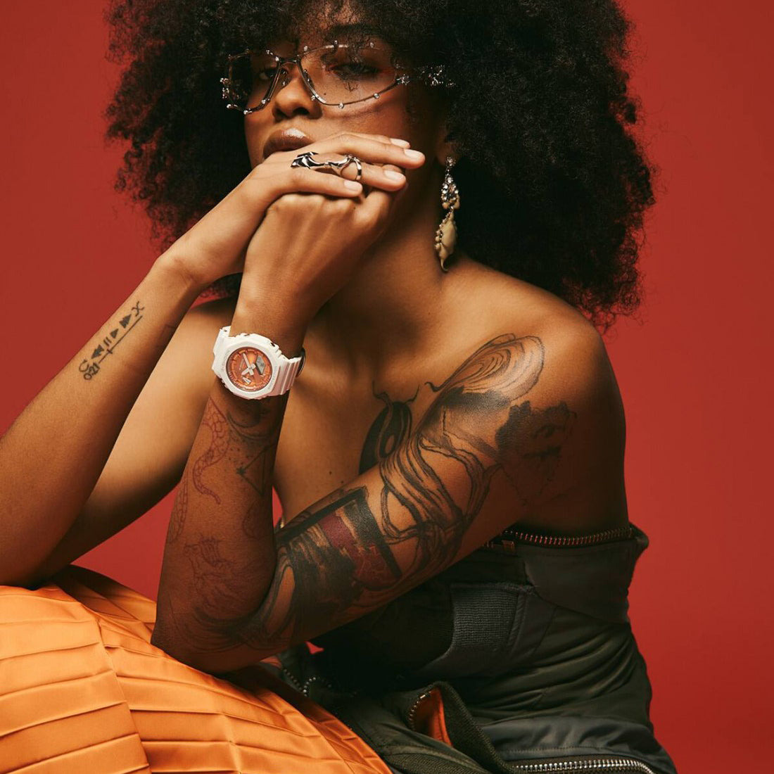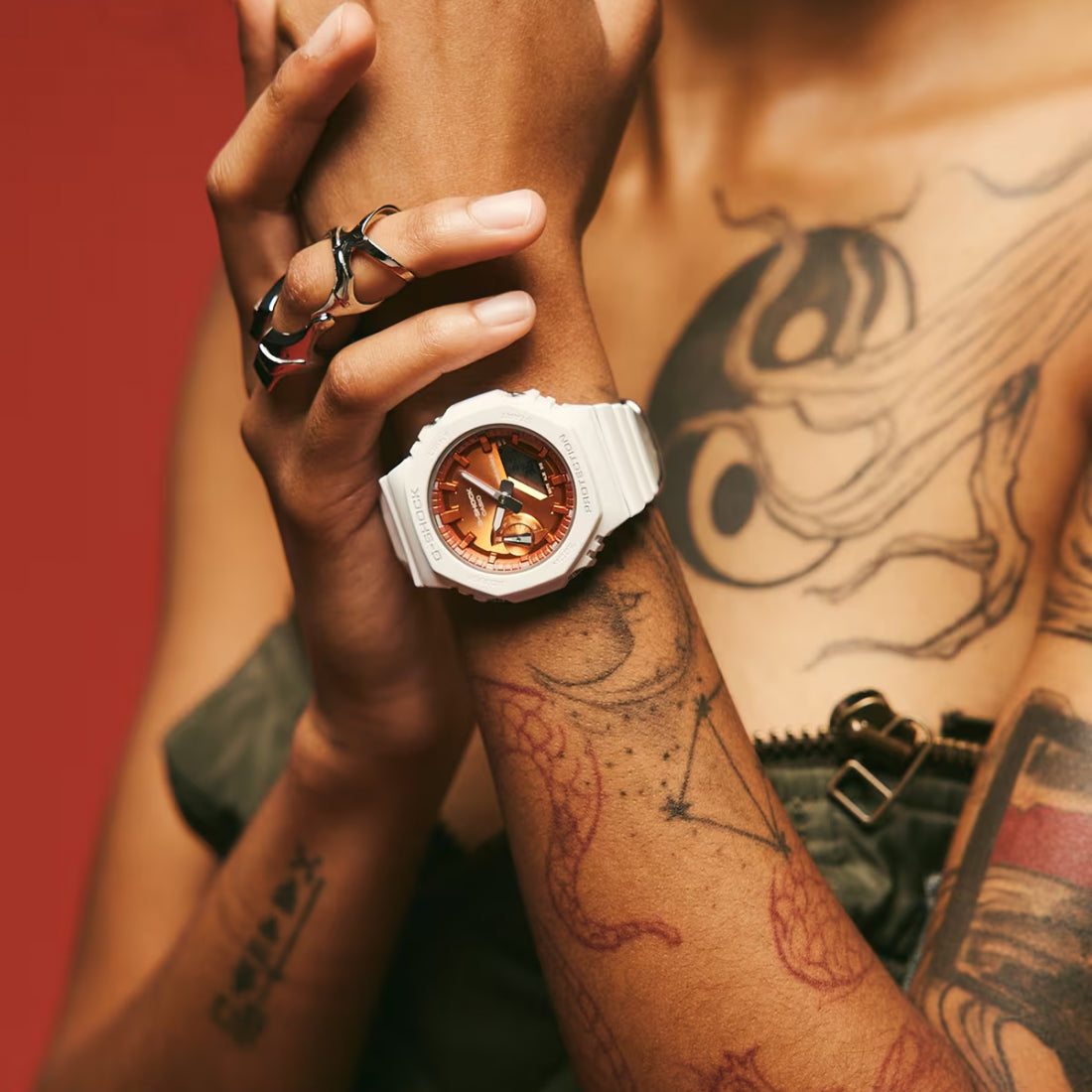 CASIO G-SHOCK GMA-S2100WS-7A OAK ADVENTURER - ساعة أنيقة باللونين الأبيض والبرتقالي لكل مستكشف