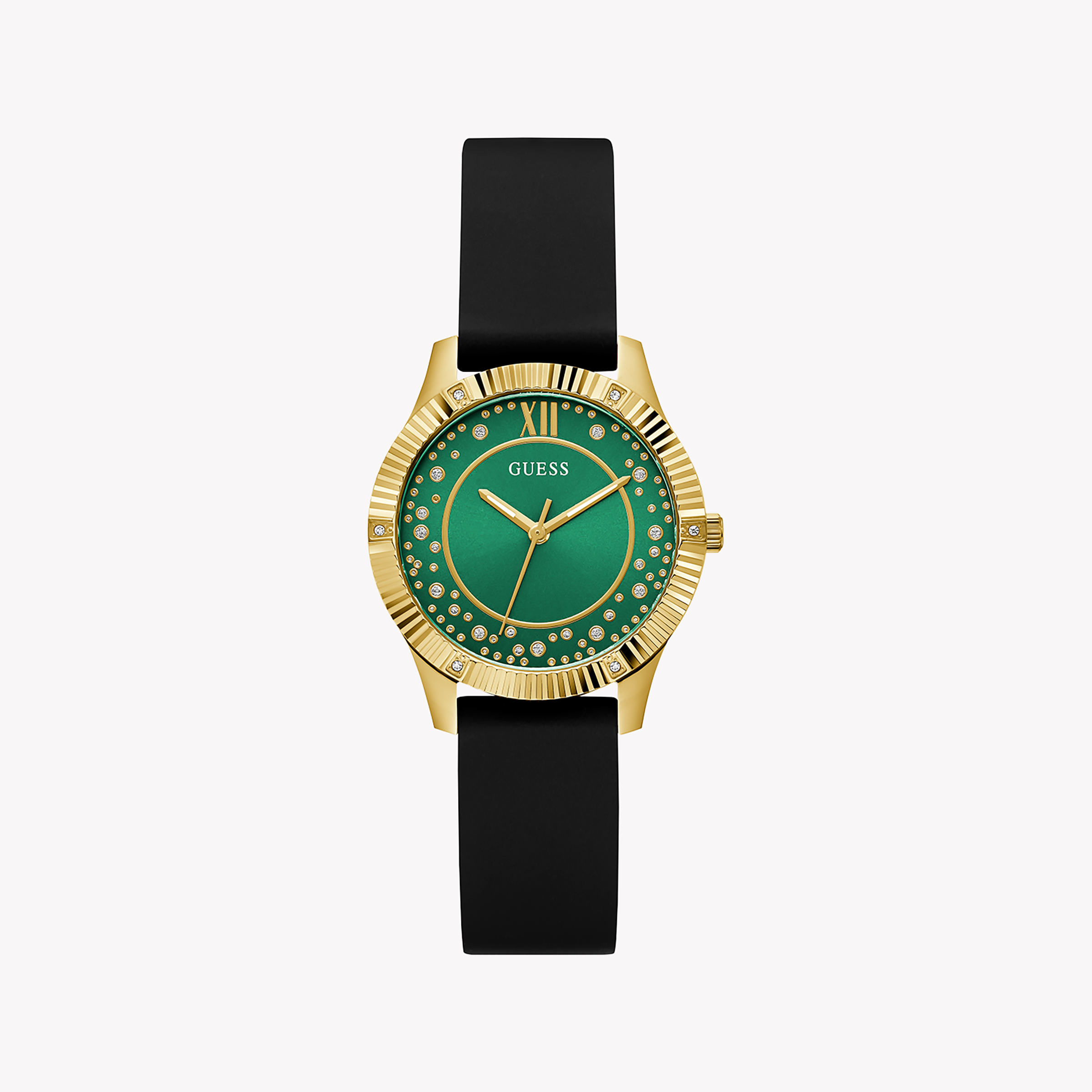 Make a statement with the GUESS GW0766L3, a stunning women's watch featuring a vibrant green dial and elegant gold stainless steel case. With its comfortable silicone band and 3 ATM water resistance, this chic timepiece blends bold style with practicality—perfect for any occasion.