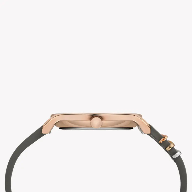 ساعة TIMEX النسائية مع هيكل من النحاس الذهبي الوردي وسوار جلدي رمادي
