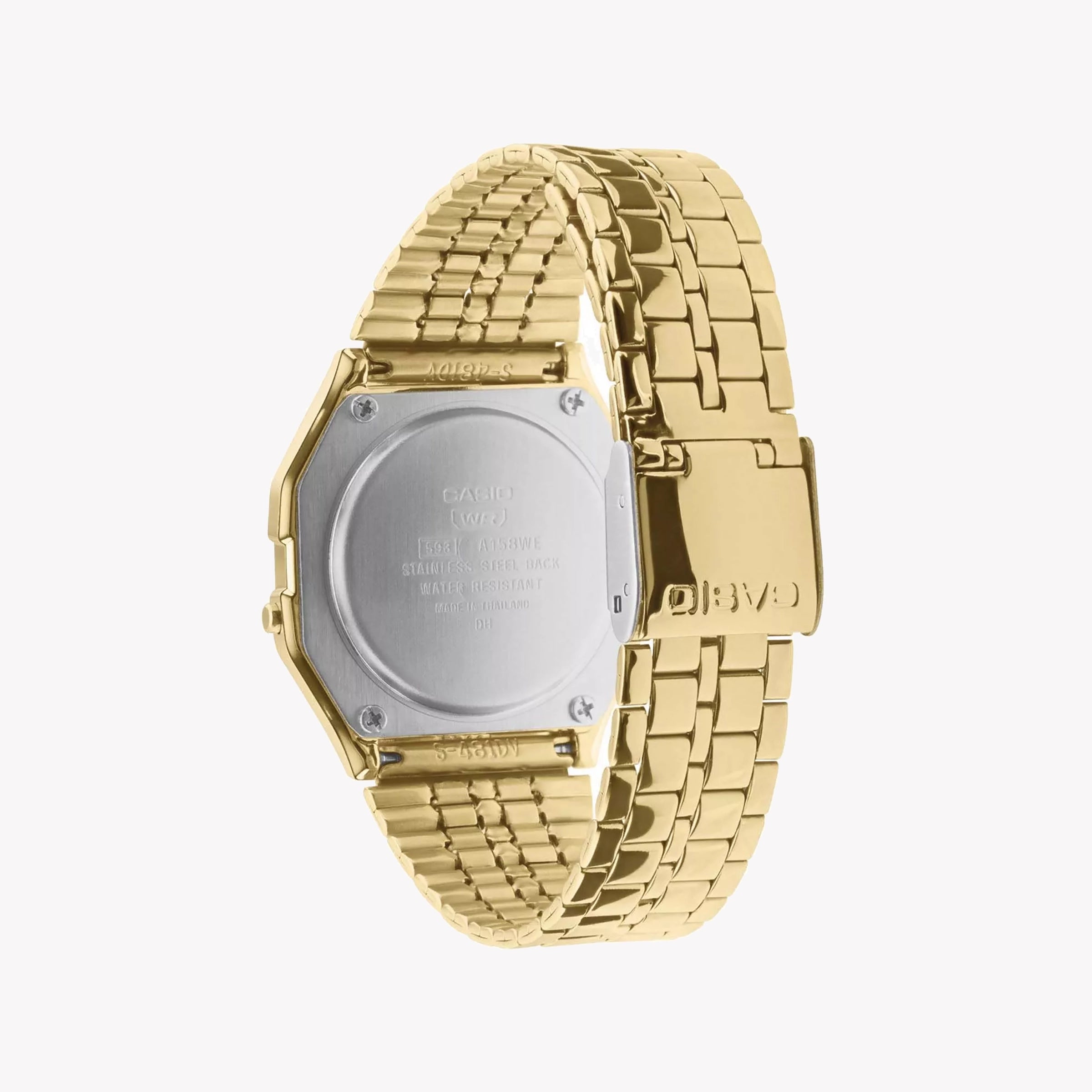 CASIO A158WETG-9AEF مقاومة للرذاذ - ساعة يد أنيقة وبسيطة للجنسين مع علبة أنيقة من الراتنج وميزات متعددة الوظائف.