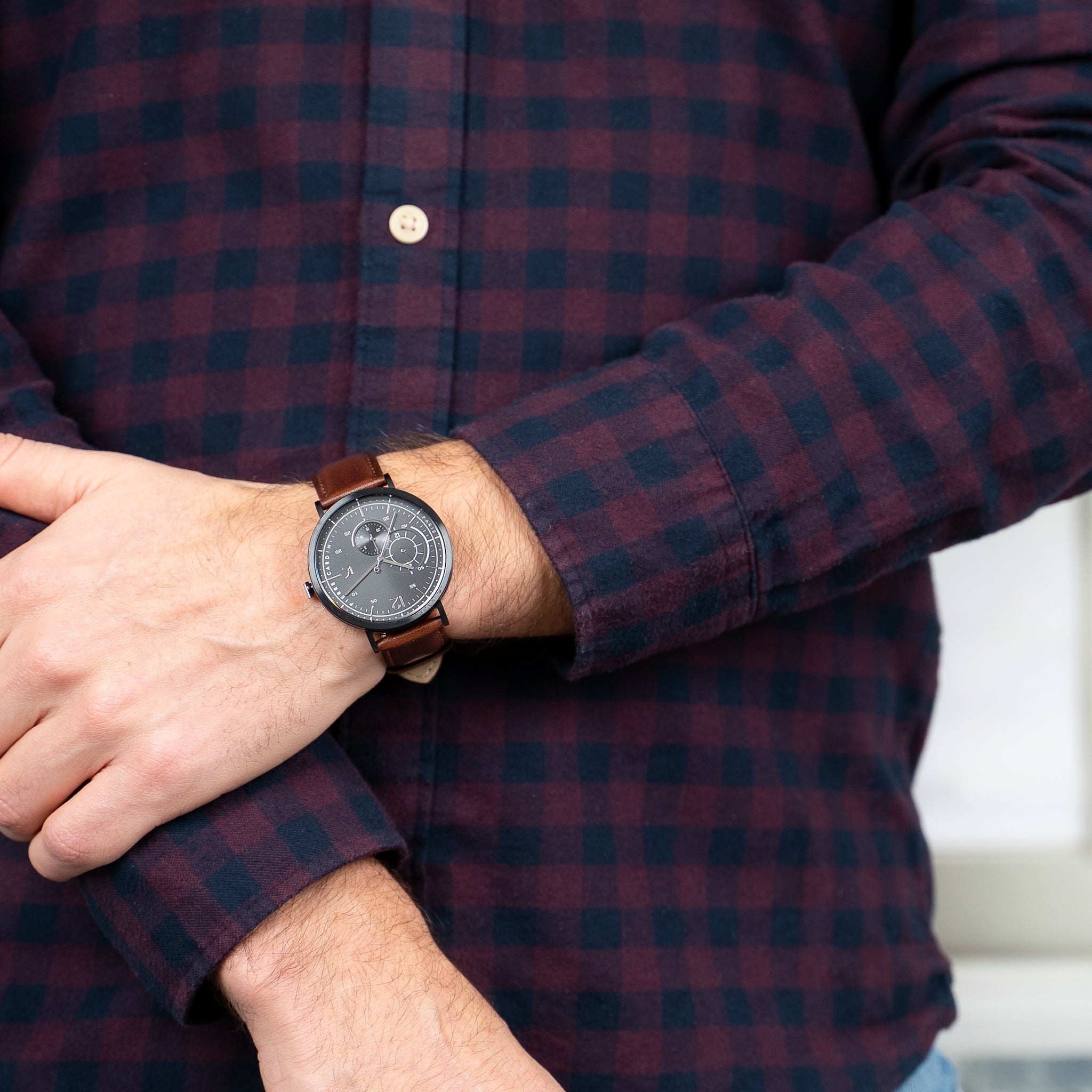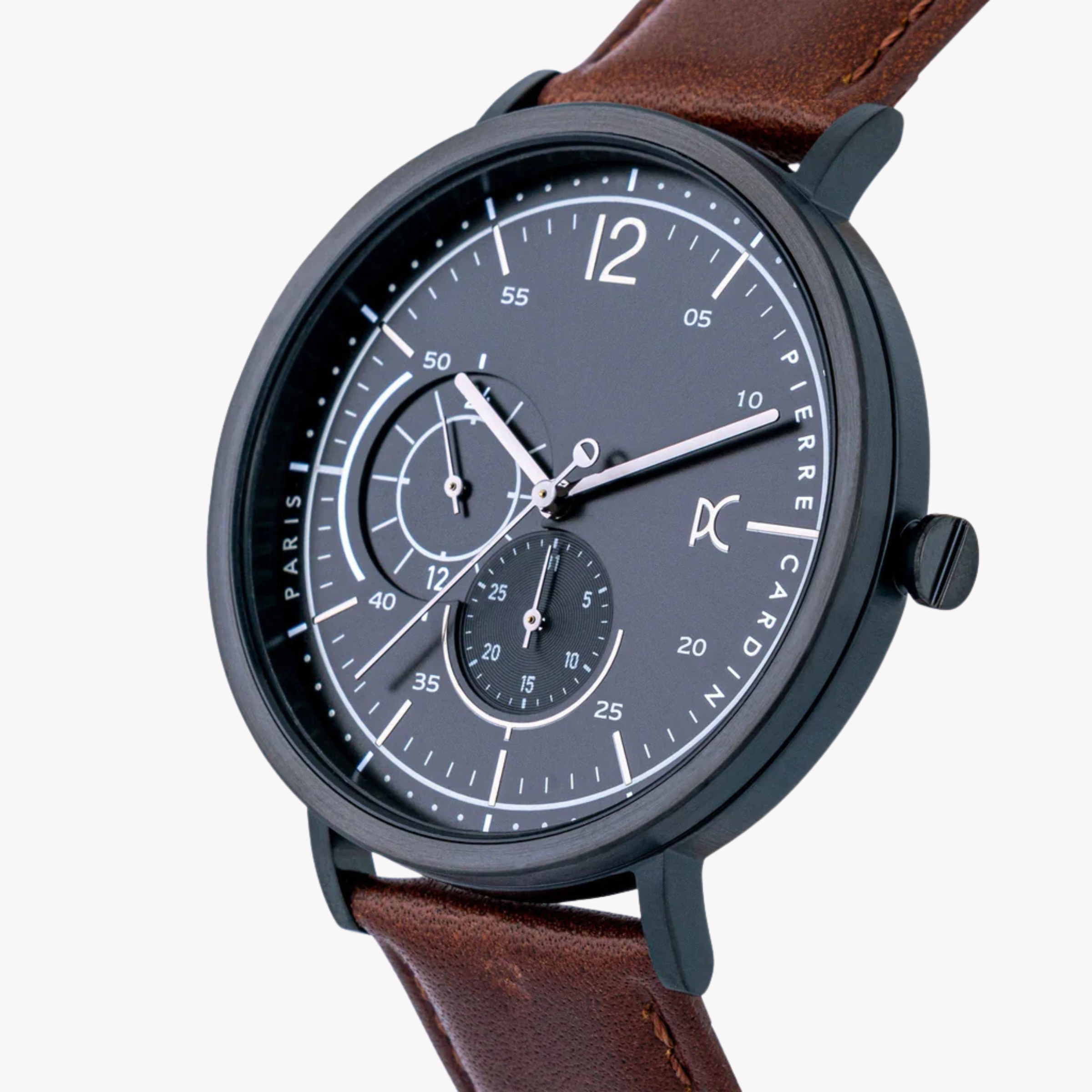 ساعة أنيقة ومظهرها فاخر، ساعة بيير كاردان بحالة مستديرة من الفولاذ المقاوم للصدأ باللون الأسود تأتي مع حزام من الجلد البني وقرص أسود. قطر الحالة 42 مم، ستكون إضافة رائعة لمظهرك.