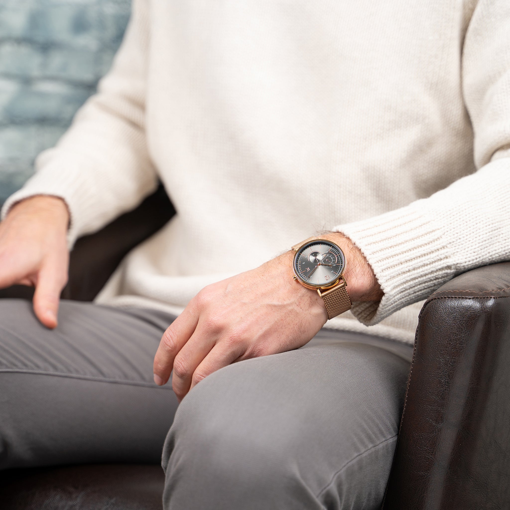ساعة بيير كاردان CBN.3029 للرجال فاخرة من الستانلس ستيل باللون الذهبي الوردي - مينا رمادية أنيقة