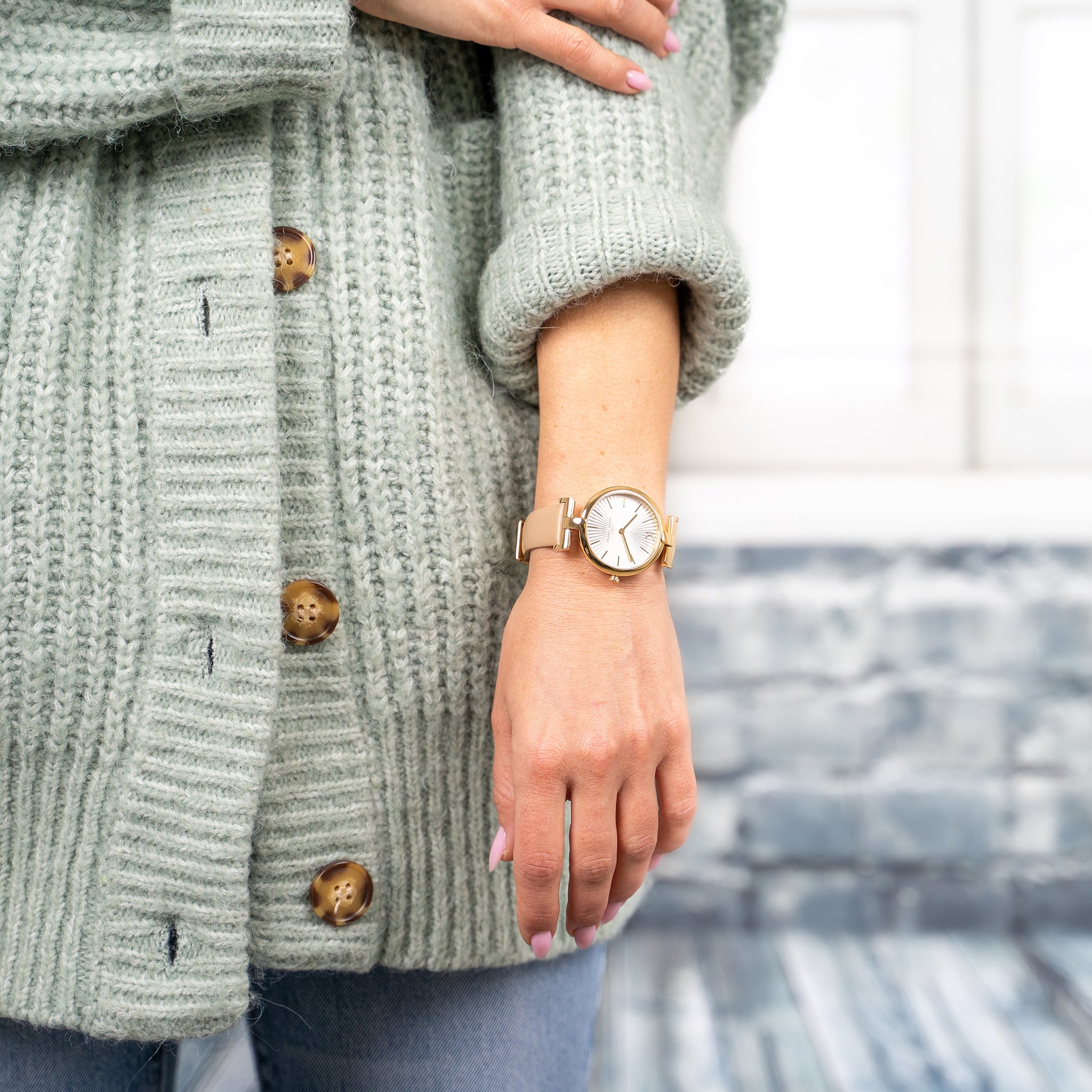 ساعة بيير كاردين للسيدات بهيكل ذهبي من الستانلس ستيل وسوار من الجلد باللون البيج