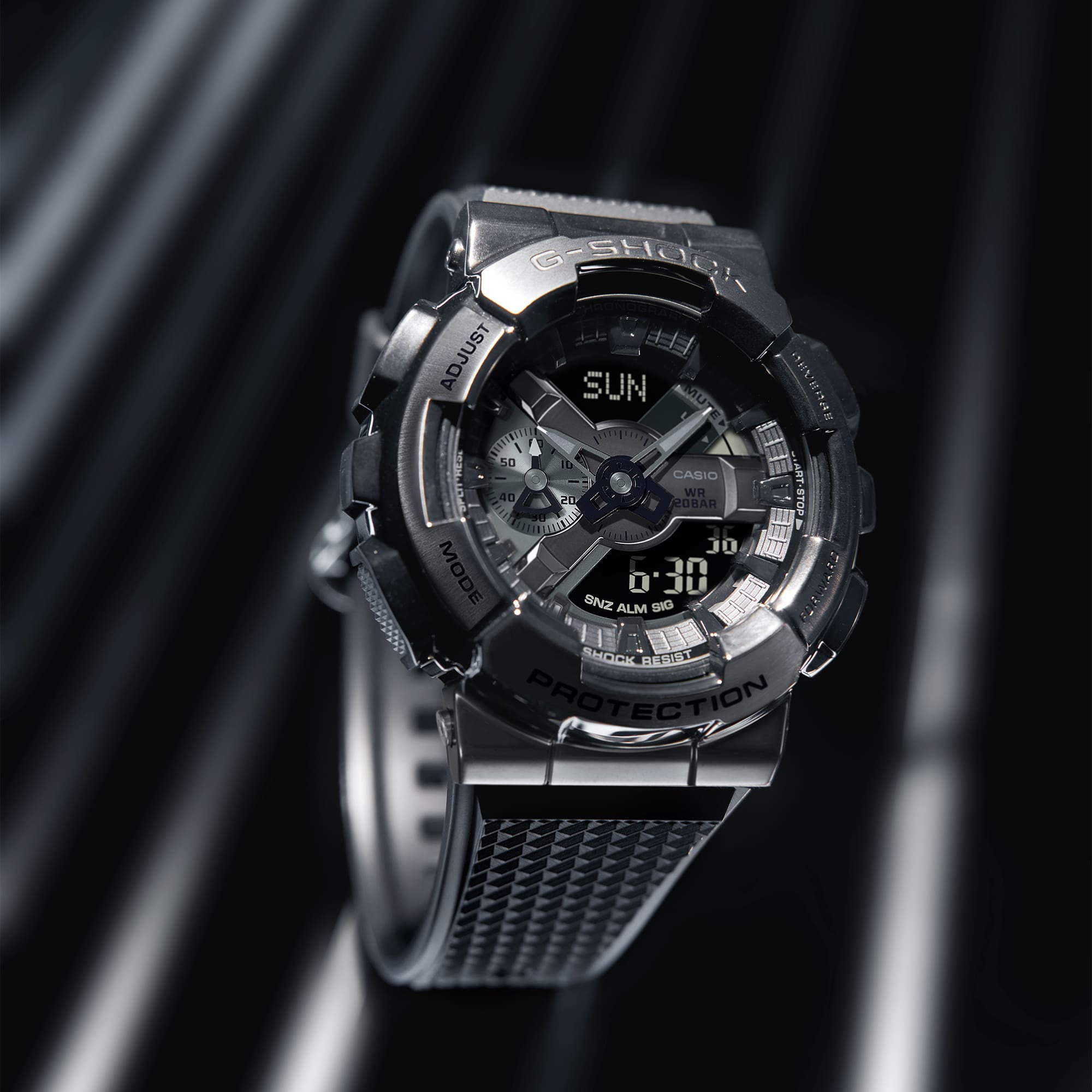 عرض إحساسك بالأناقة مع GM-110BB-1ADR، ساعة تجمع بين القوة والأناقة الرياضية. اترك انطباعاً جريئاً مع ساعة مصممة لتواكب نمط حياتك الديناميكي.