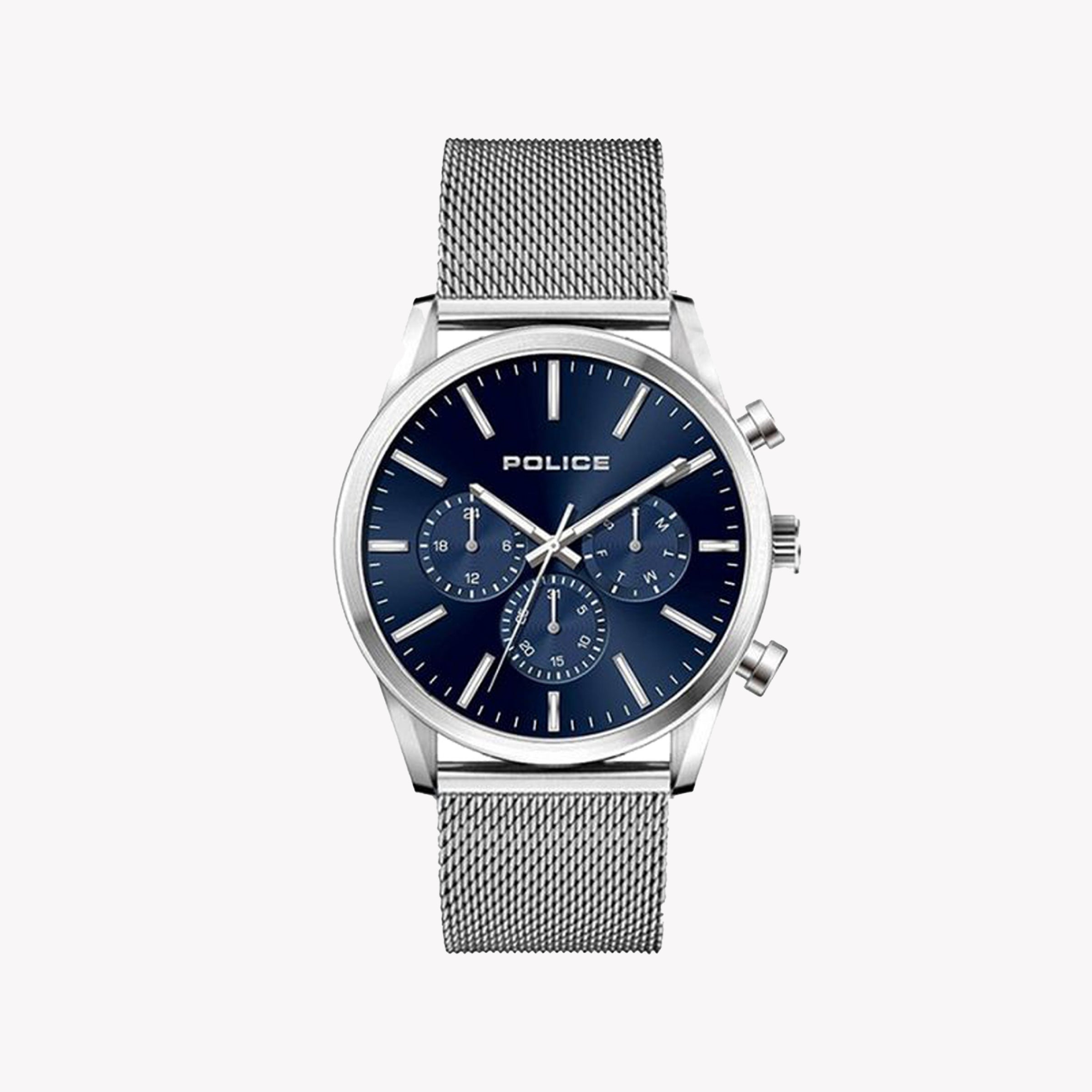 ساعة بوليس P15599JS03MM - ساعة رجالية أنيقة بسوار فضي من الستانلس ستيل ومينا زرقاء