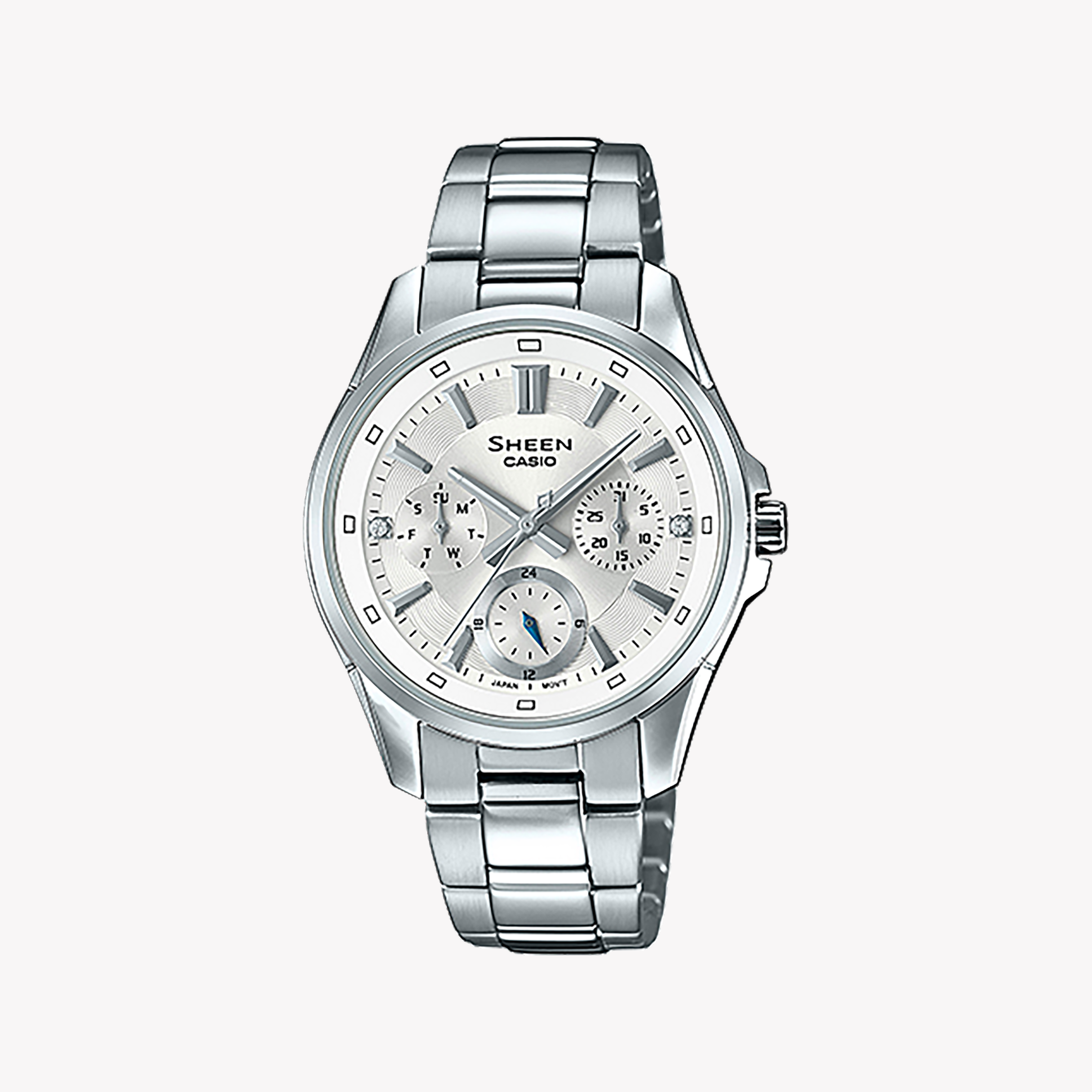 Kaufen Sie die Casio SHE-3060D-7AUDR Damenuhr: eine 39 mm große Edelstahluhr mit silbernem Finish, wasserdicht bis 50 m und präziser Genauigkeit von ±20 s/Monat. Perfekt für jeden Anlass!