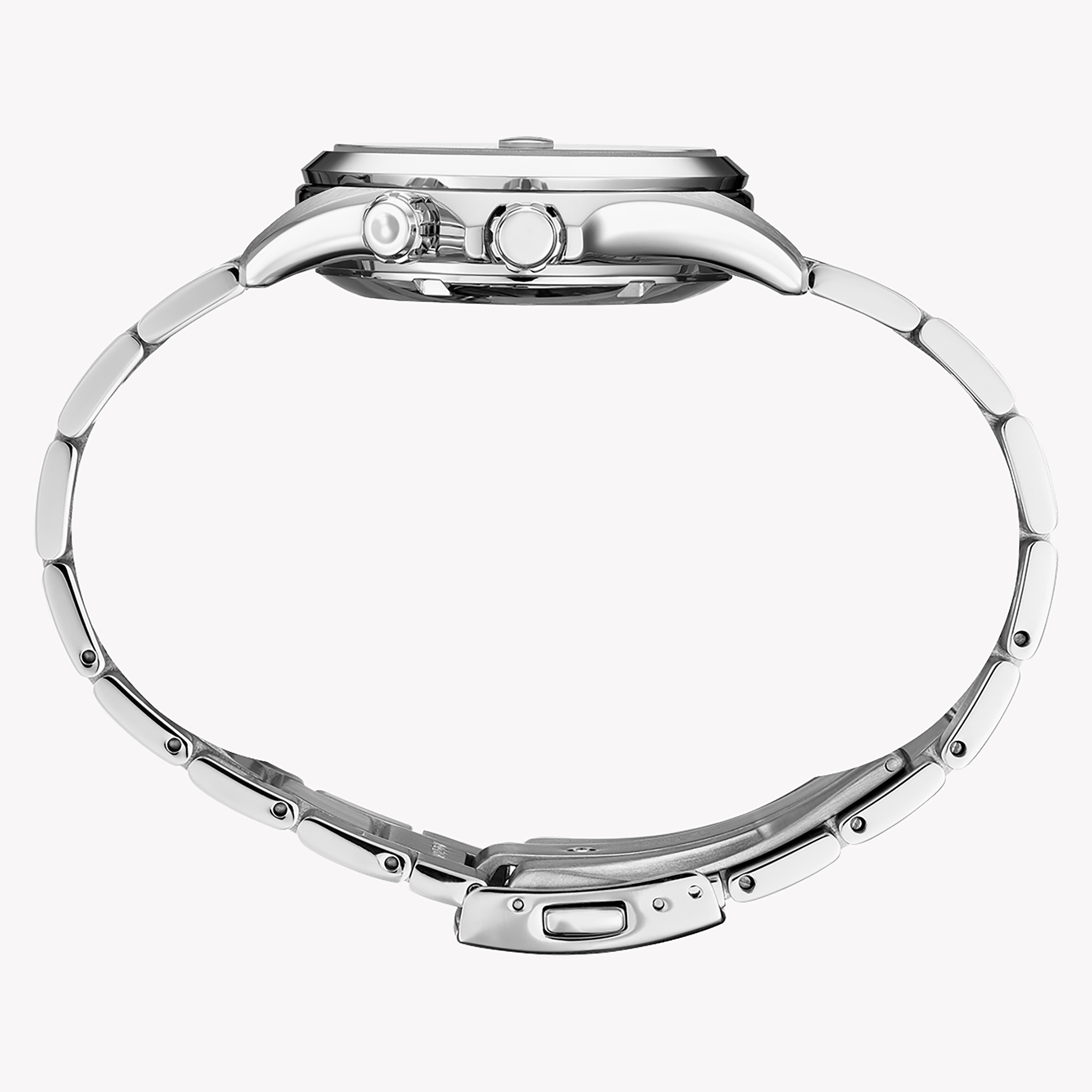 - Bold Dial: The black dial presents a striking contrast to the silver case and band, offering maximum legibility and a sophisticated look that commands attention.