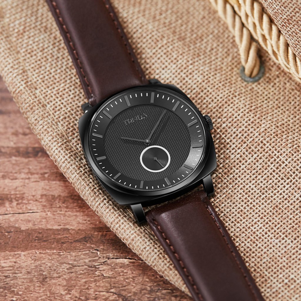 ساعة ترندا مربعة للرجال من الستانلس ستيل باللون الأسود - طراز خالد مع سوار من الجلد البني