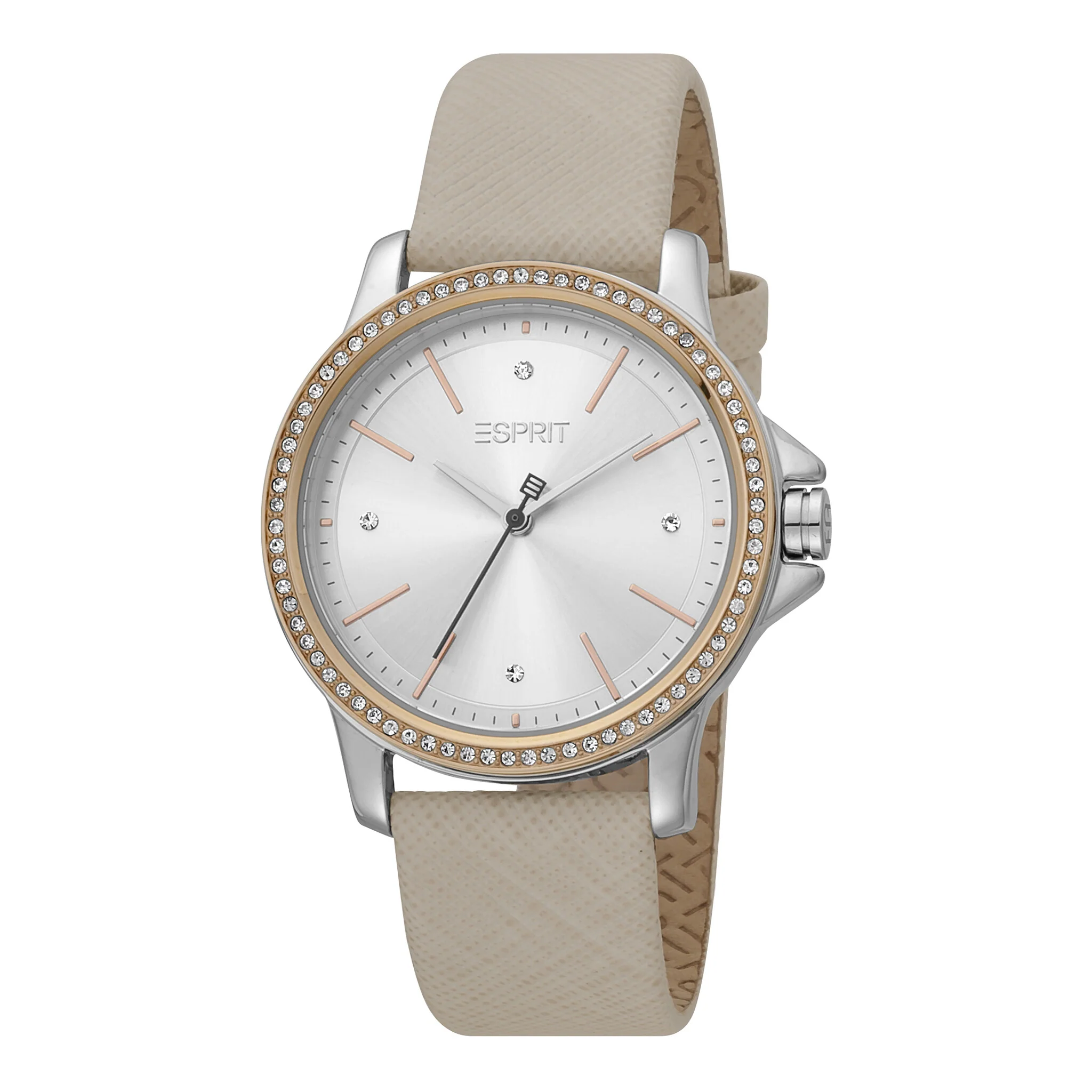 ساعة ESPRIT للسيدات بهيكل فضي من الستانلس ستيل وسوار جلد بيج