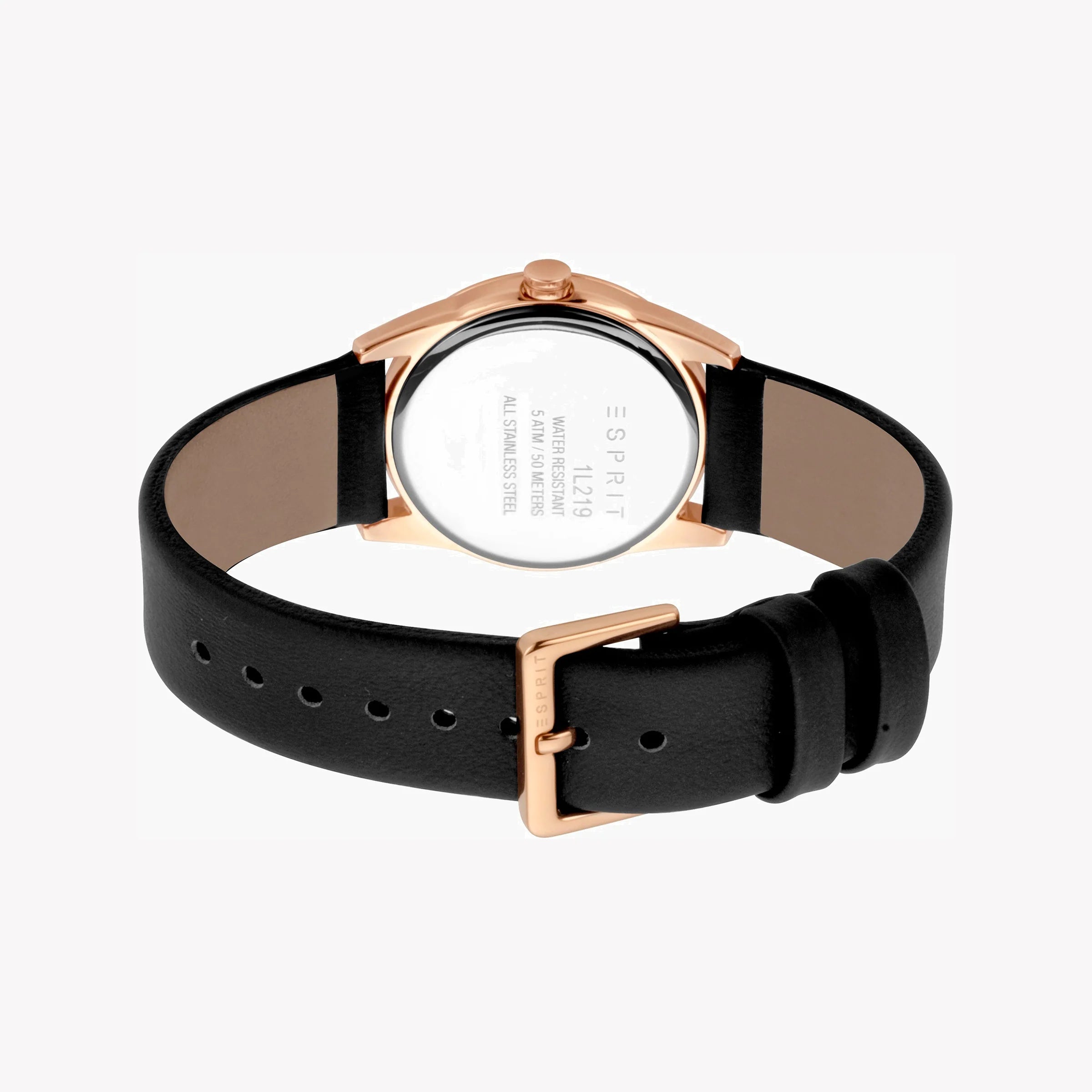 ساعة ESPRIT للسيدات بهيكل من الستانلس ستيل باللون الذهبي الوردي وسوار من الجلد باللون الأسود