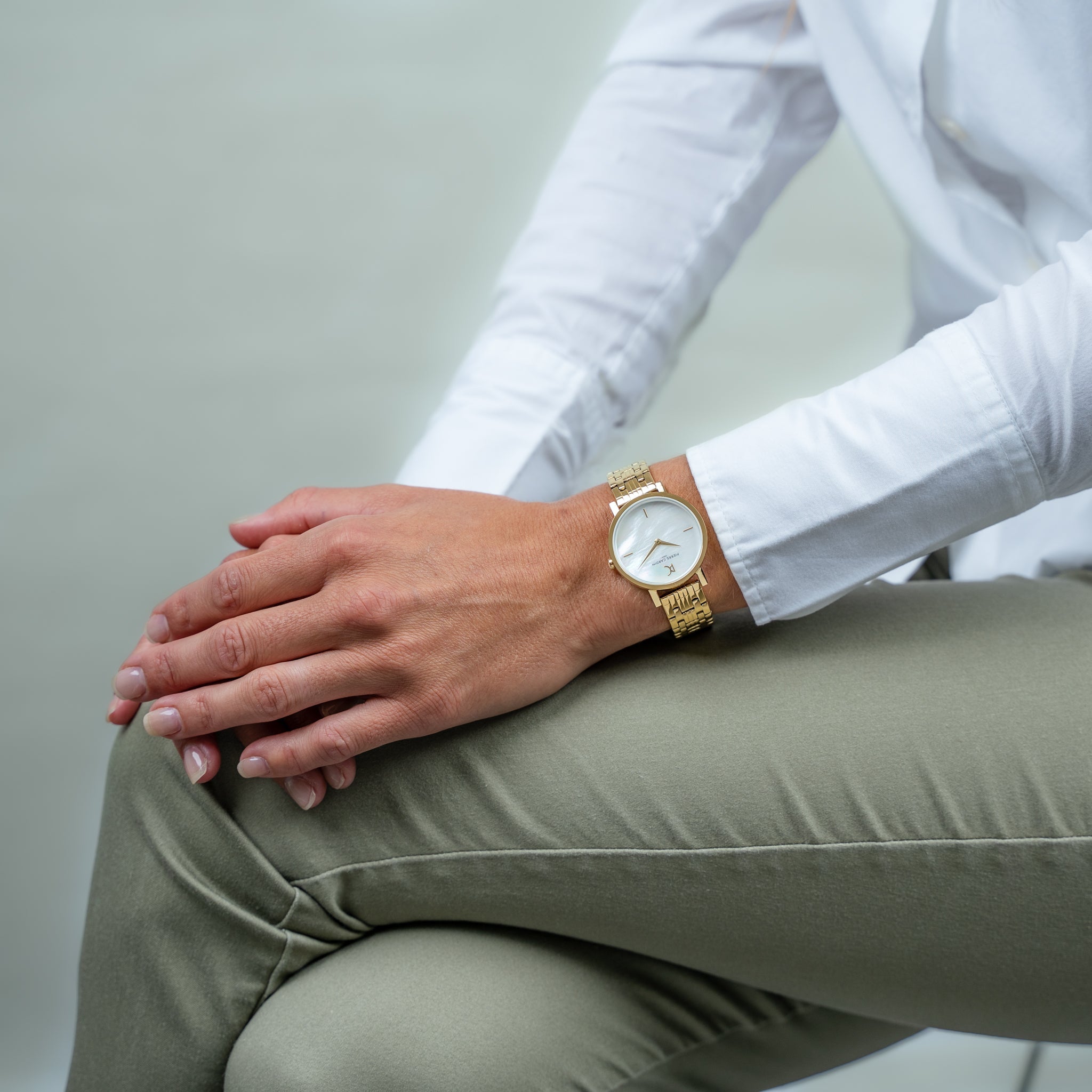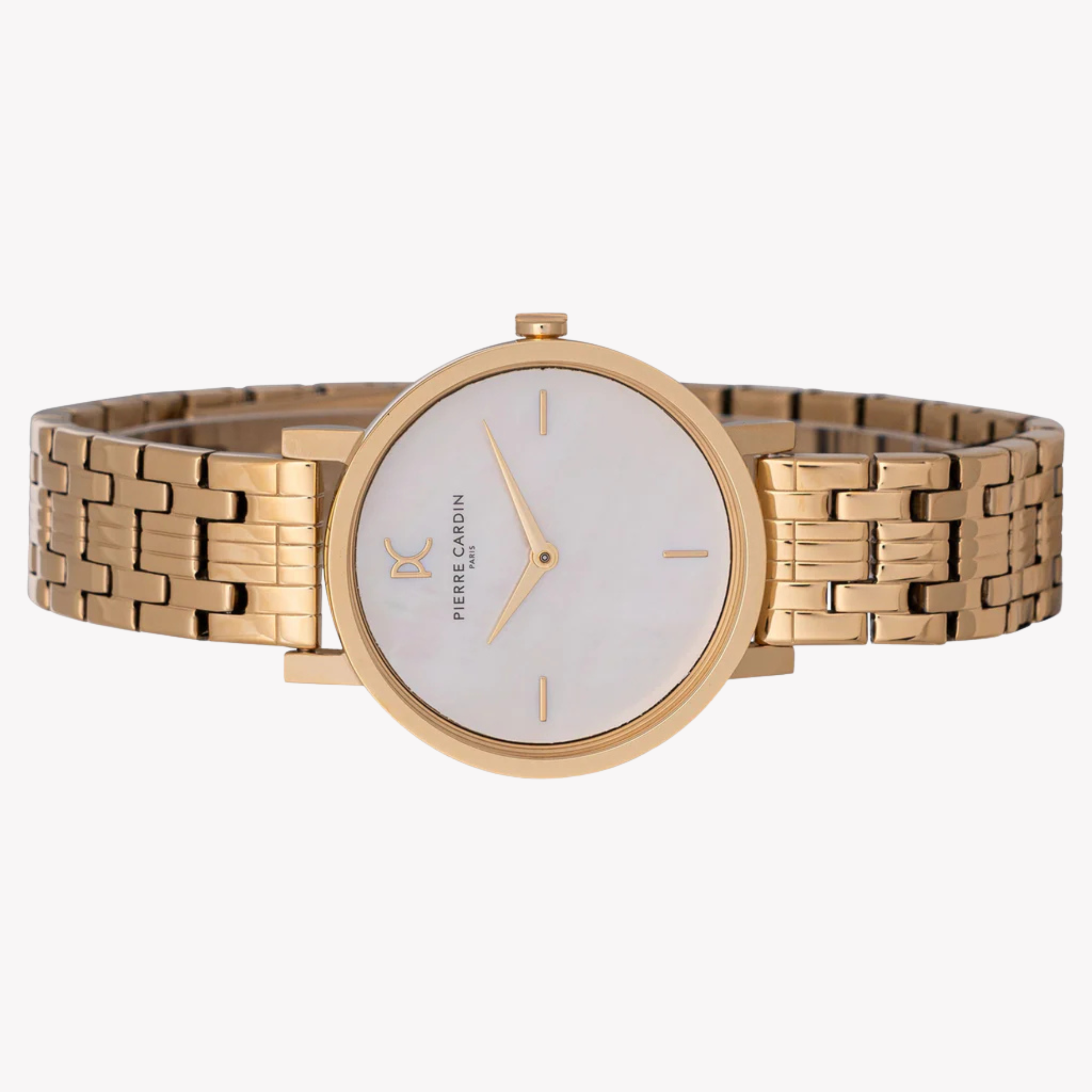 ساعة أنيقة وفاخرة المظهر، ساعة بيير كاردان ذات علبة معدنية دائرية باللون الذهبي تتميز بسوار معدني ذهبي وقرص باللون الأبيض من أم اللؤلؤ. بقطر علبة يبلغ 32 مم، ستكون إضافة رائعة لملابسك.