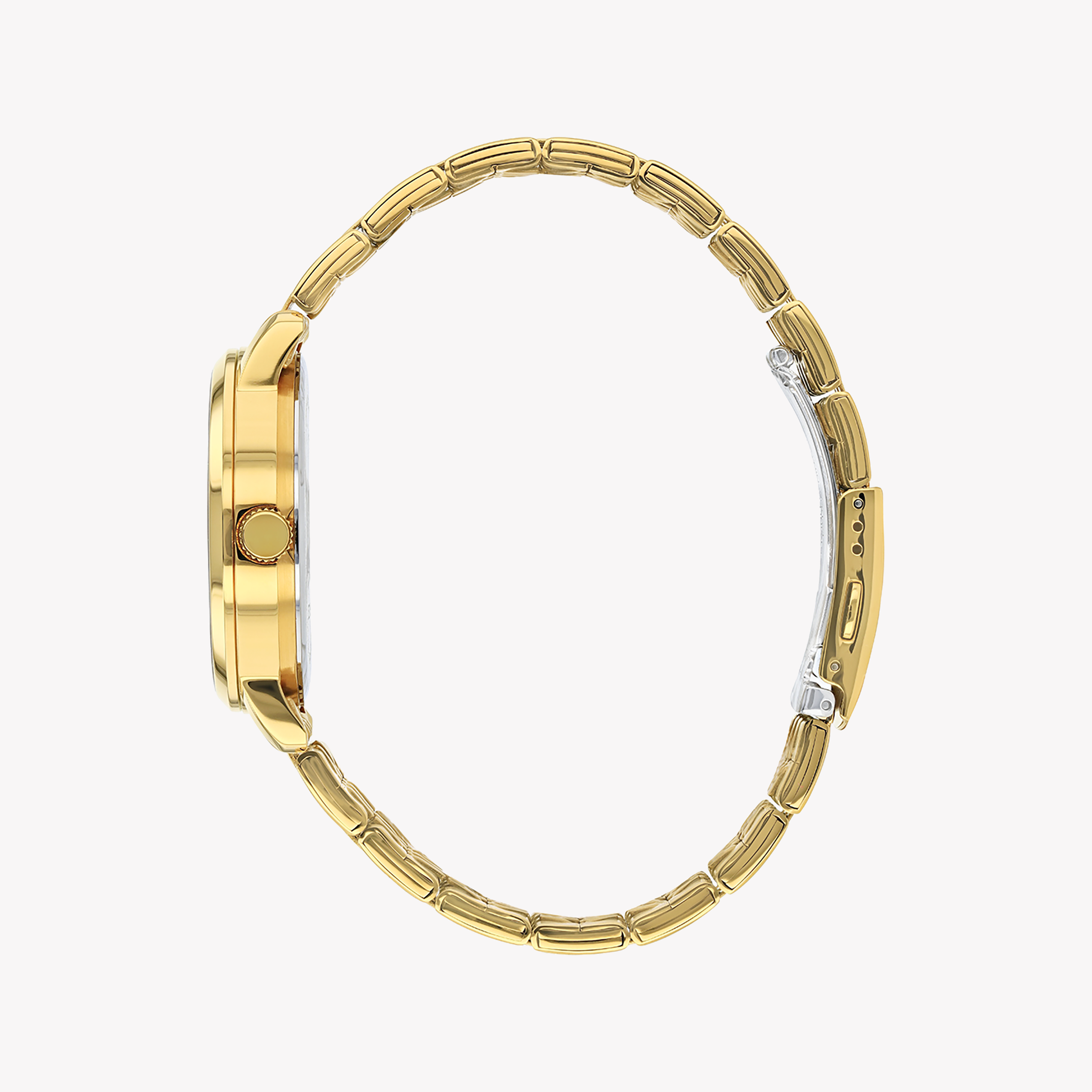 - جمالية جريئة: مع هيكل مصنوع من الفولاذ المقاوم للصدأ بقطر 41.5 مم بلون ذهبي لامع، فإن هذه الساعة تتطلب الانتباه وتكمل أي زي، سواء كان رسميًا أو غير رسمي.