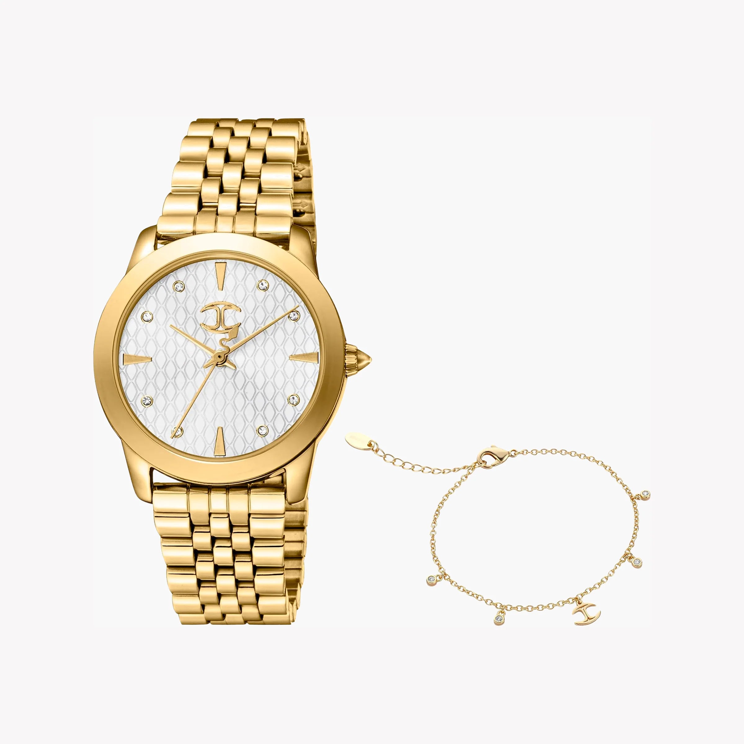 خالدة، أنيقة، متطورة. هذه ساعة Just Cavalli النسائية تحتوي على كل شيء. بدءًا من السوار المصنوع من الفولاذ المقاوم للصدأ الذهبي إلى علبة الفولاذ المقاوم للصدأ ذات اللونين الفضي والذهبي بقطر 34 مم، وبالطبع، القرص الفضي الأنيق، تعتبر هذه الساعة تمثيلًا مثاليًا لأعلى درجات الأناقة.