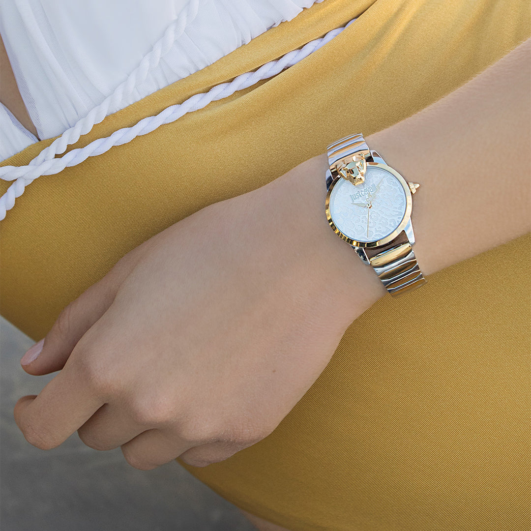 خالدة، متطورة، أنيقة. تتميز هذه الساعة النسائية من Just Cavalli بكل ما تحتاجه. من حزام الفولاذ المقاوم للصدأ ذو اللونين الفضي والذهبي إلى العلبة المستديرة المصنوعة من الفولاذ المقاوم للصدأ ذو اللونين الفضي والذهبي بقطر 32 مم وبالطبع المينا الفضية الأنيقة، تمثل هذه الساعة التطور الأنيق الأمثل.