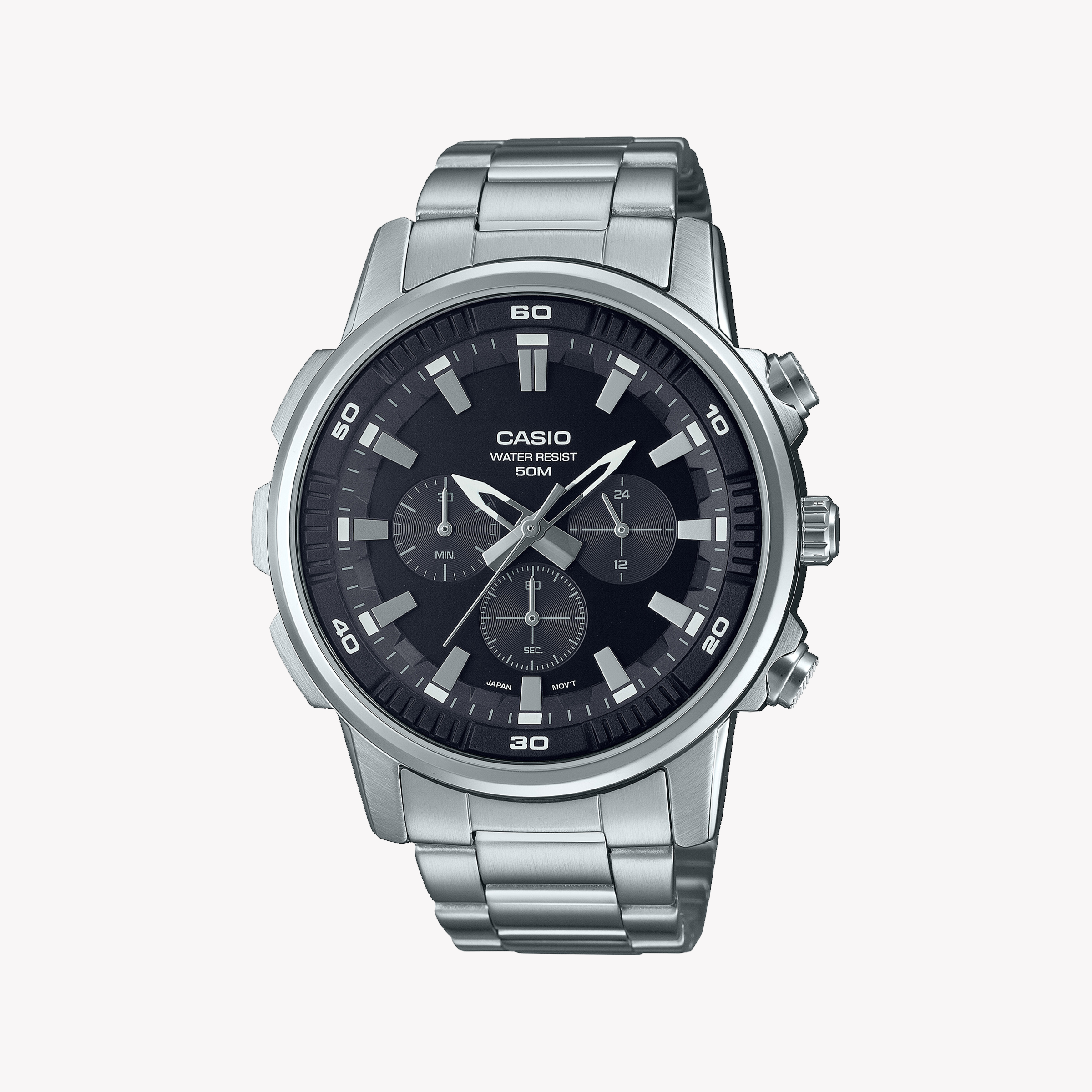 ساعة كاسيو MTP-E505D-1AVDF - ساعة كرونوغراف رياضية للرجال بسوار من الستانلس ستيل ومينا باللون الأسود