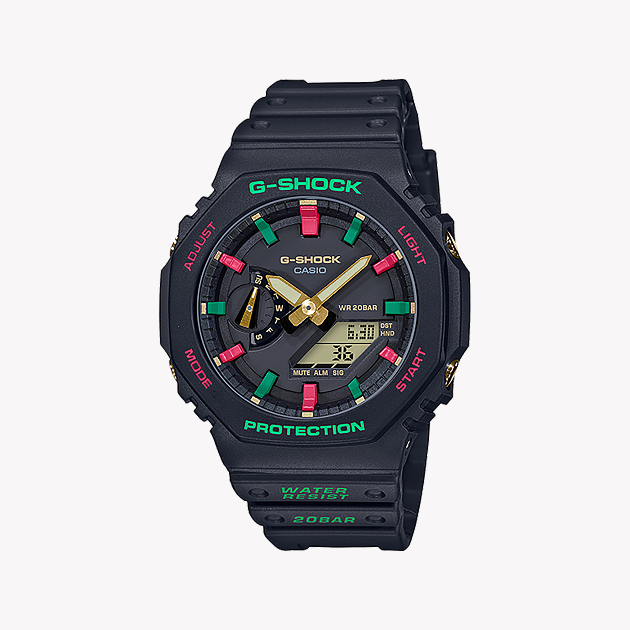 - تصميم لافت: تتميز GA-2100TH-1ADR بحالة وحزام من الراتينج الأسود الجريء، مع واجهة رقمية أنيقة، مما يجعلها إكسسوارًا متعدد الاستخدامات لأي مناسبة.