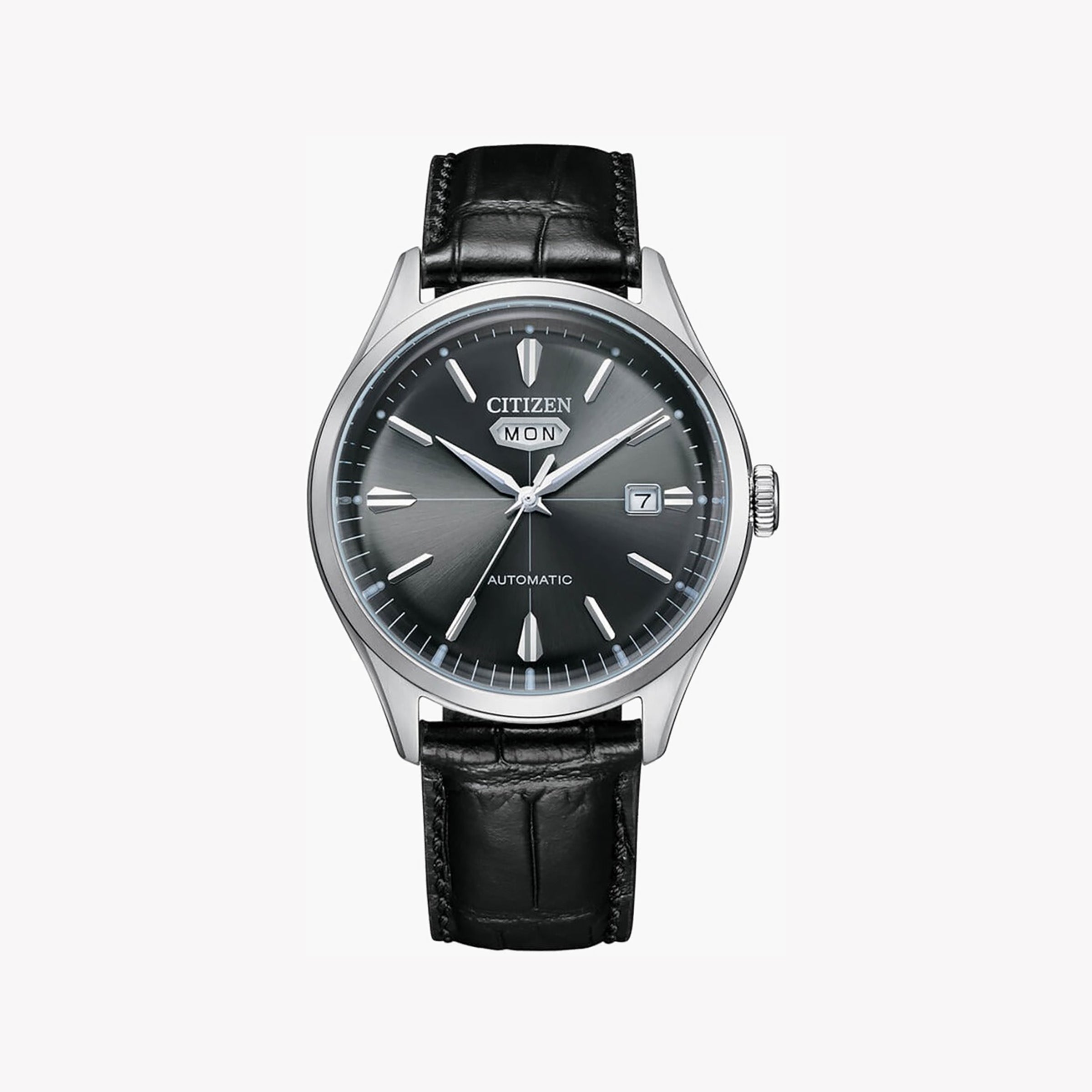 CITIZEN NH8390-20H: An automatic men's watch with a 40mm stainless steel case, black calf leather band, day/date display & 5 ATM water resistance. Style meets function.