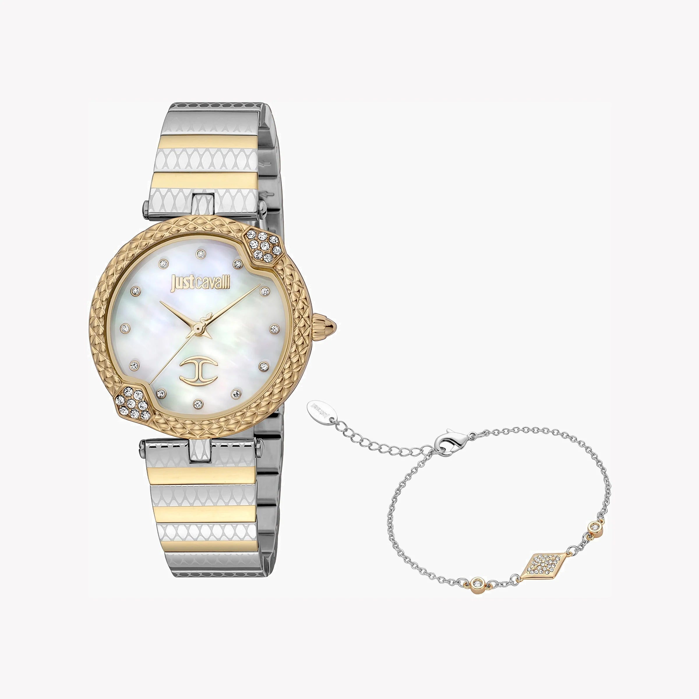 خالدة، متطورة، أنيقة. تتمتع هذه الساعة النسائية من Just Cavalli بكل ما تحتاجه. من حزام الفولاذ المقاوم للصدأ 2T-S&G إلى العلبة المستديرة من الفولاذ المقاوم للصدأ 2T-S&G بقطر 32 مم وبالطبع الهيكل الأنيق الأبيض، تمثل هذه الساعة التطور الأنيق الأمثل.