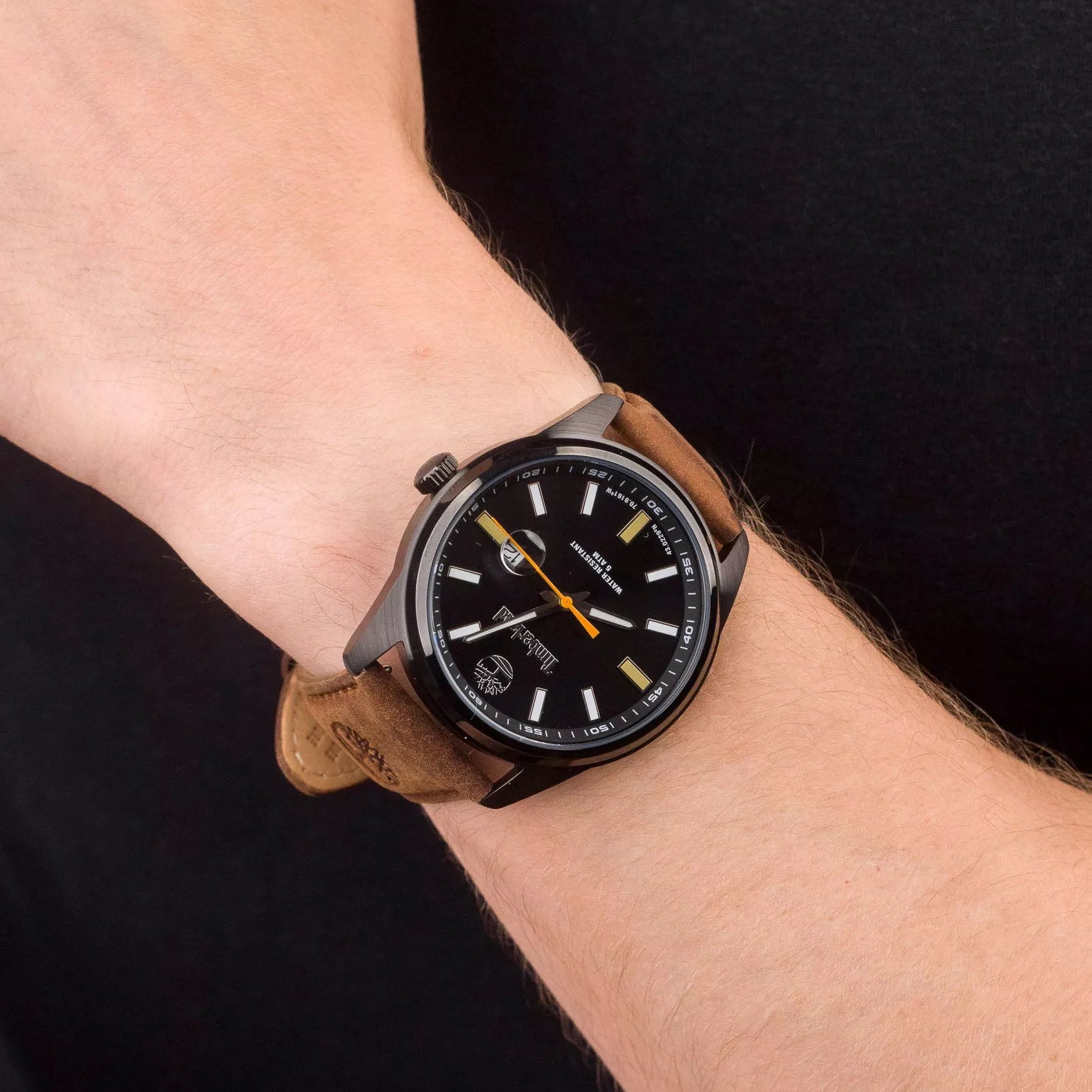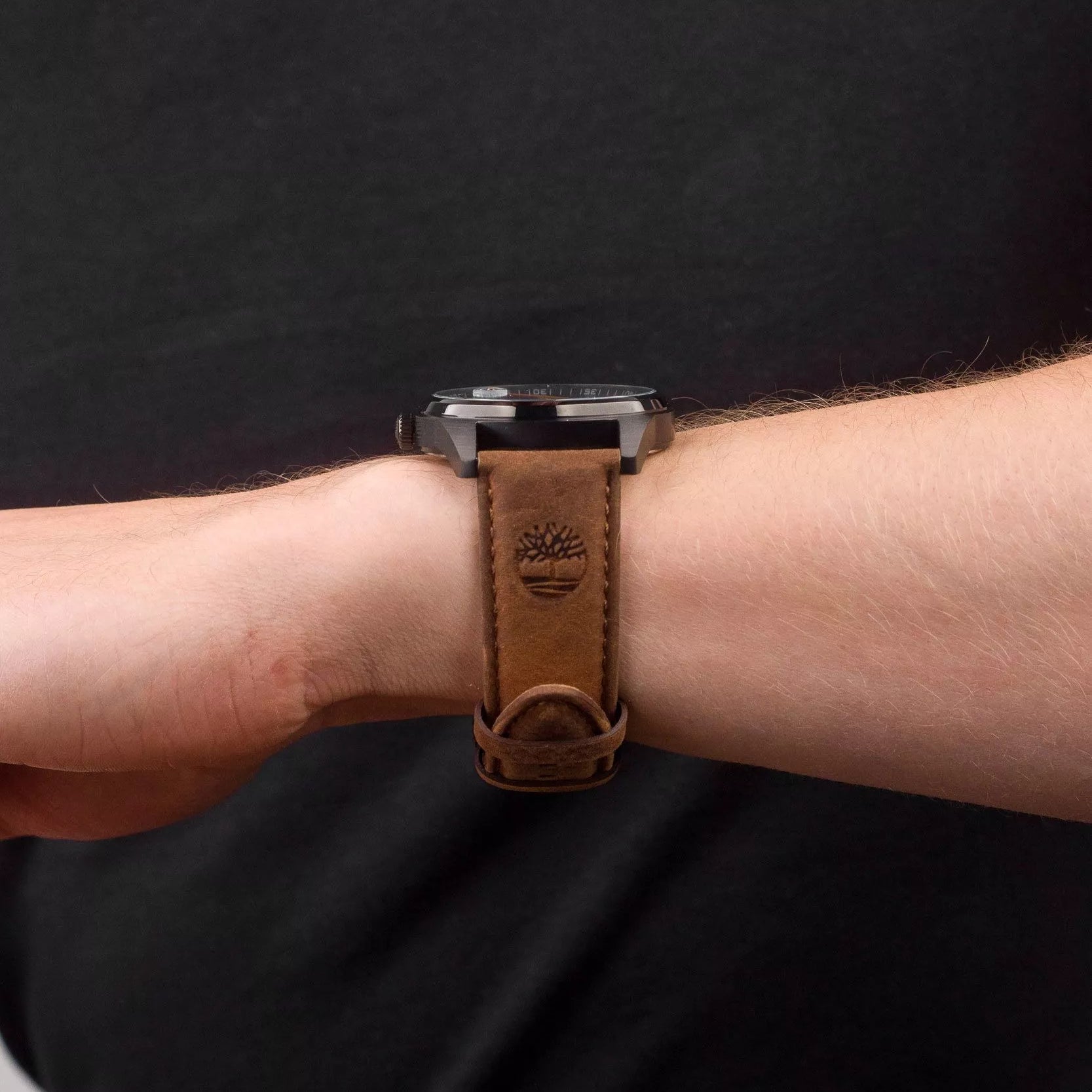 Embrace sophistication with the TIMBERLAND Men's Black Stainless Steel Watch. Featuring a robust 45mm case, brown leather band, and precise quartz movement, this elegant timepiece defines rugged luxury.