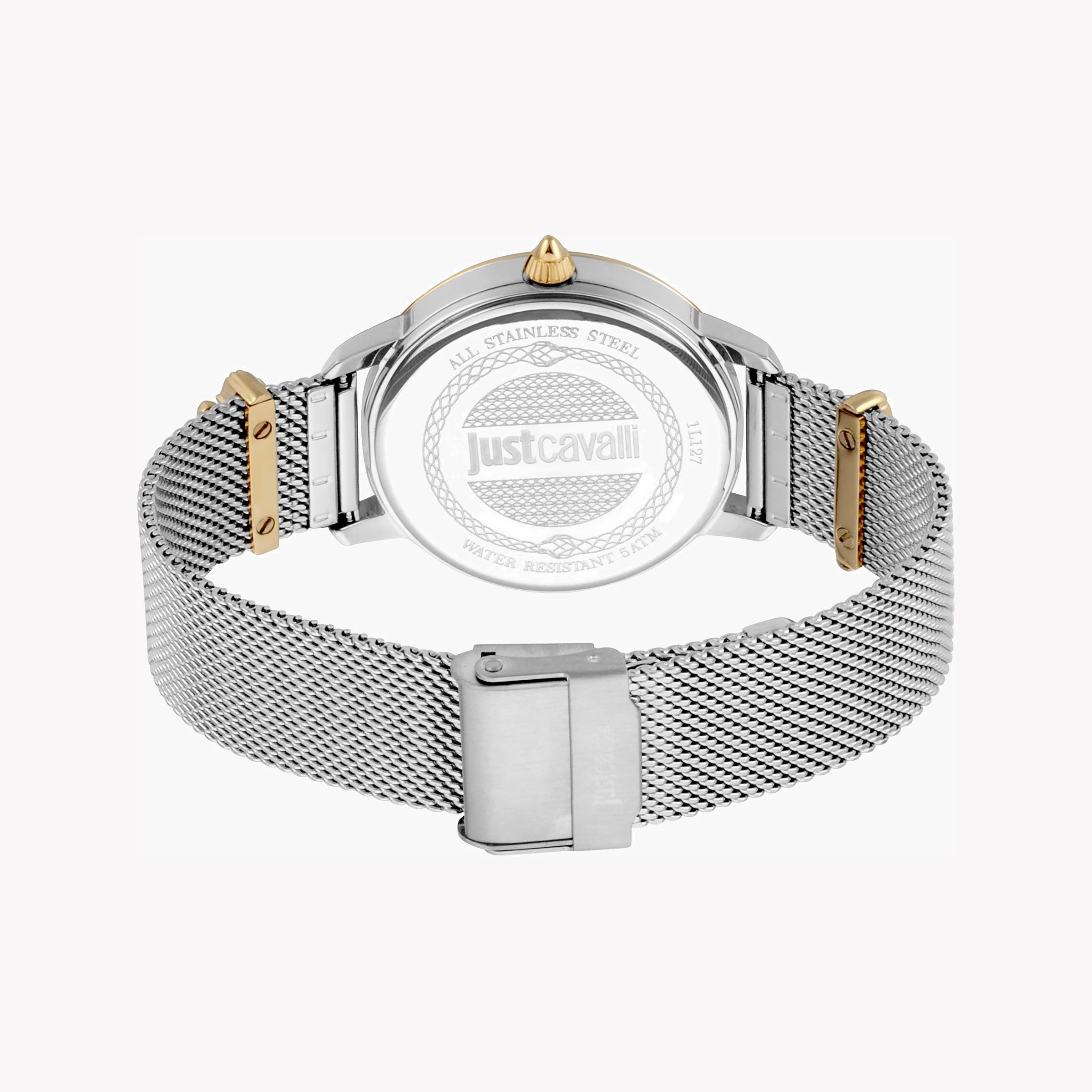 خالدة، أنيقة، راقية. تتميز ساعة Just Cavalli النسائية بكل هذه الصفات. من الحزام الفضي المصنوع من الفولاذ المقاوم للصدأ إلى العلبة الفضية المستديرة من الفولاذ المقاوم للصدأ بقطر 38 مم وبالطبع المينا الفضية الأنيقة، تعد هذه الساعة تمثيلاً مثالياً للرقي الأسمى.