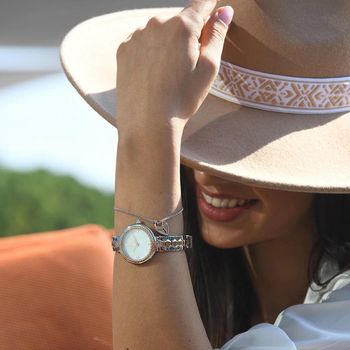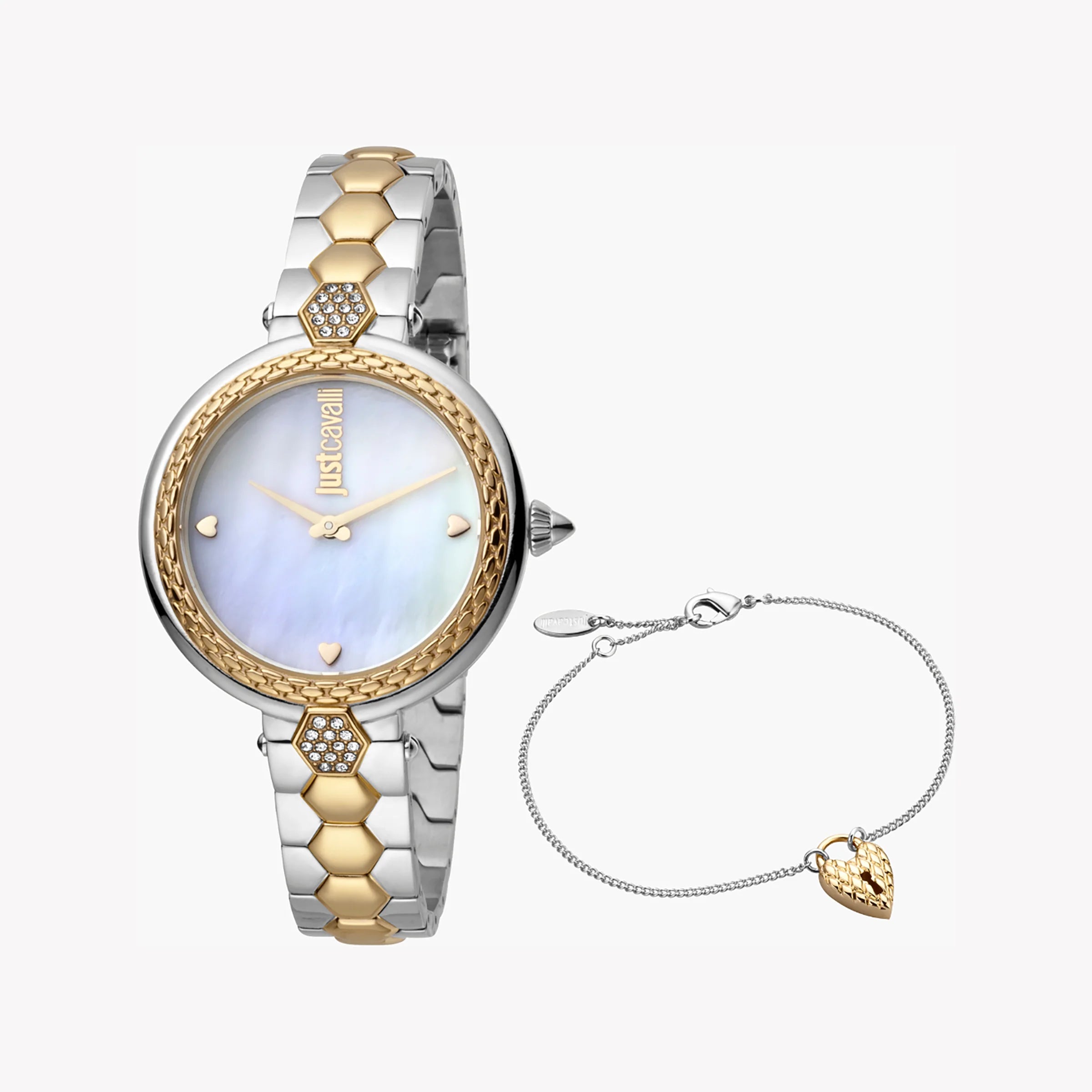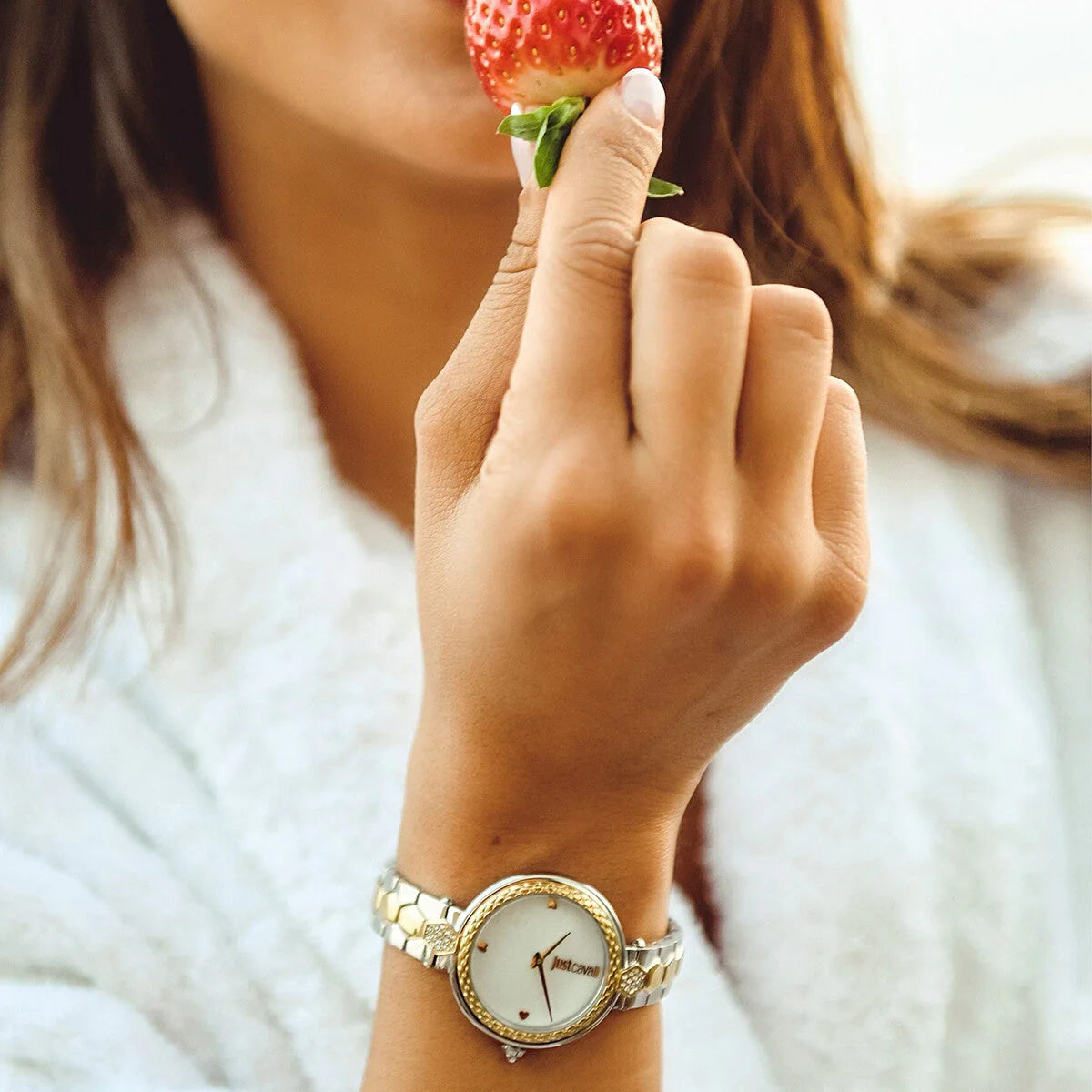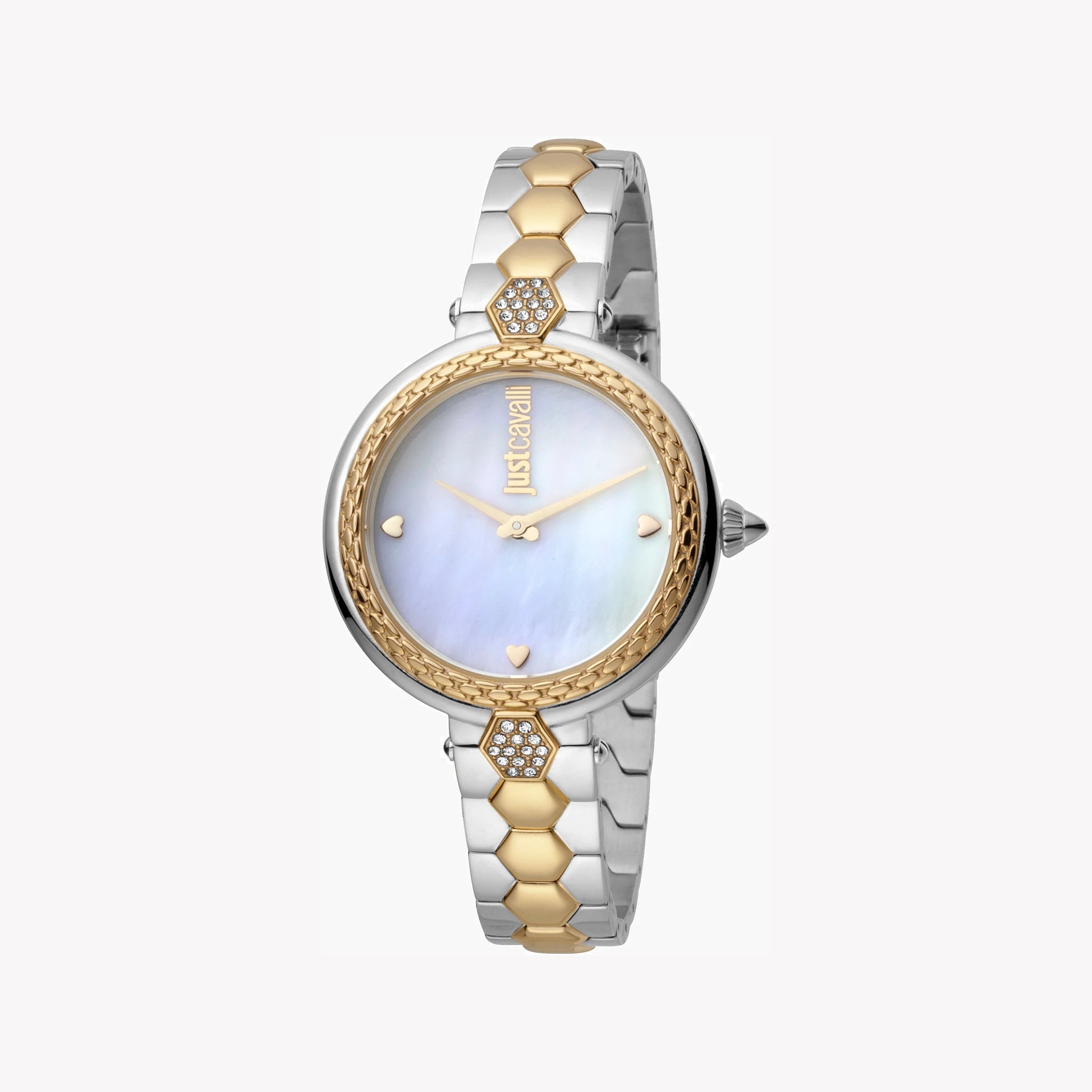 تجمع هذه الساعة النسائية من Just Cavalli بين الأناقة والتطور والرقي، فهي مصنوعة من حزام من الفولاذ المقاوم للصدأ 2T-S&G وقرص أبيض من اللؤلؤ وقطر 34 ملم وسمك 6.95 ملم من الفولاذ المقاوم للصدأ المطلي بالذهب. هذه الساعة هي التمثيل الكامل للأناقة الفائقة.