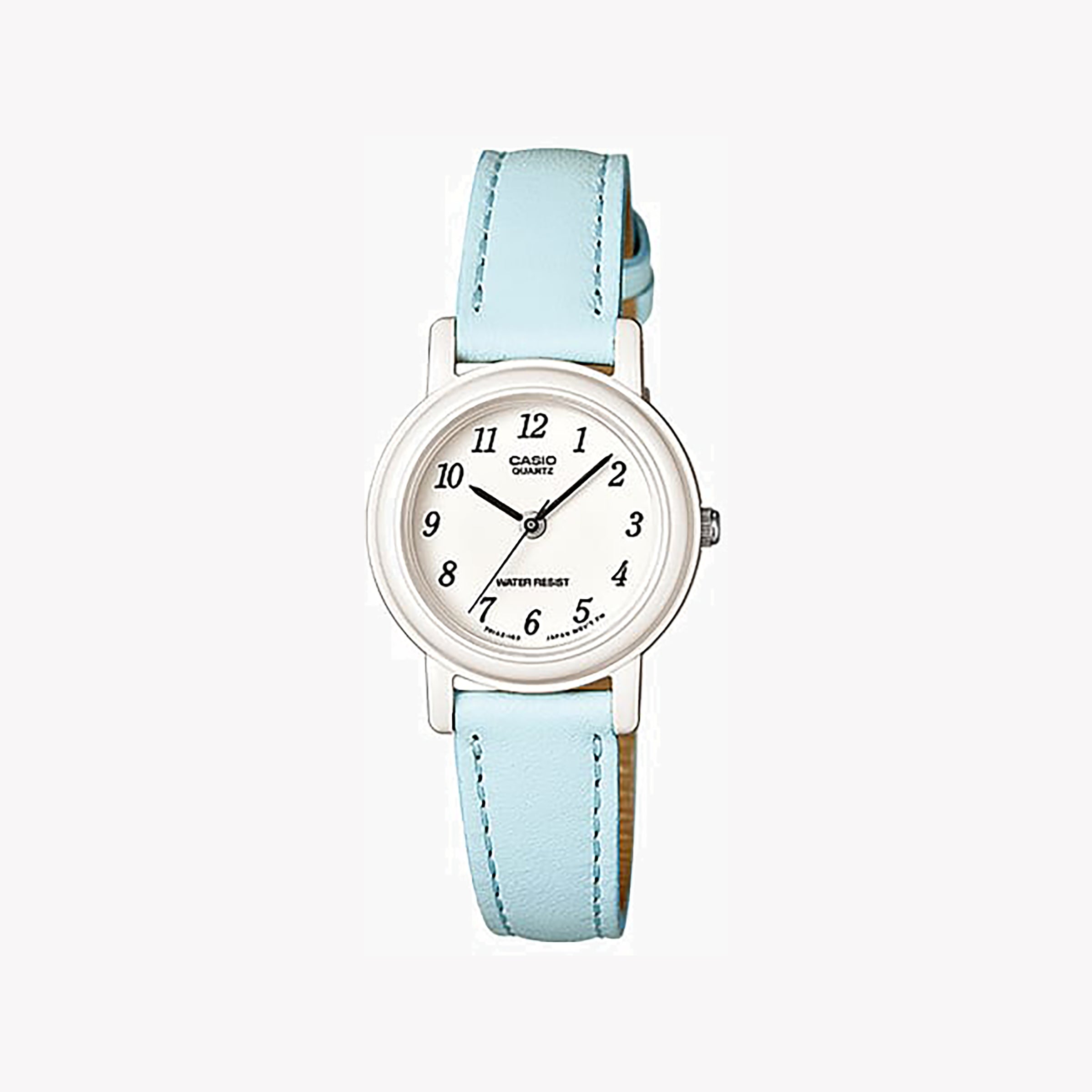 ساعة كاسيو النسائية بهيكل من الراتنج باللون الأبيض وسوار من الجلد الطبيعي باللون الأزرق الفاتح