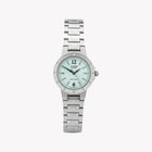 - جمالية مثيرة للاهتمام: تتميز الساعة بعلبة من الفولاذ المقاوم للصدأ بحجم 32 مم، تعرض لوناً فضياً رائعاً يتناغم بشكل جميل مع قرصها الأزرق الغني، مما يوازن تمامًا بين الحيوية والاعتدال.
