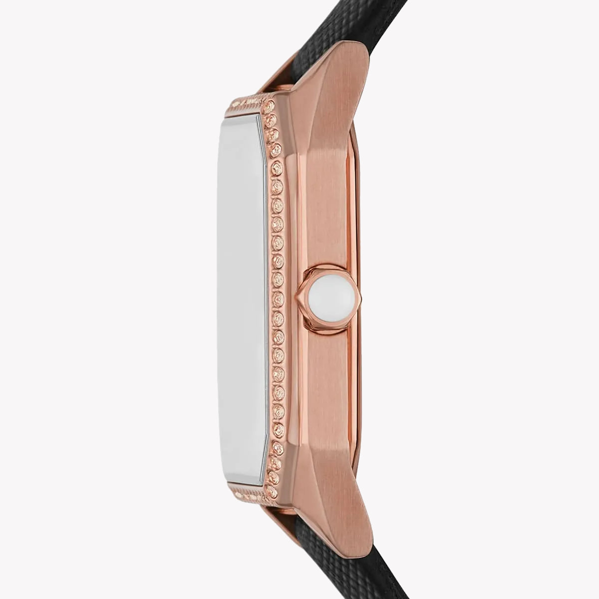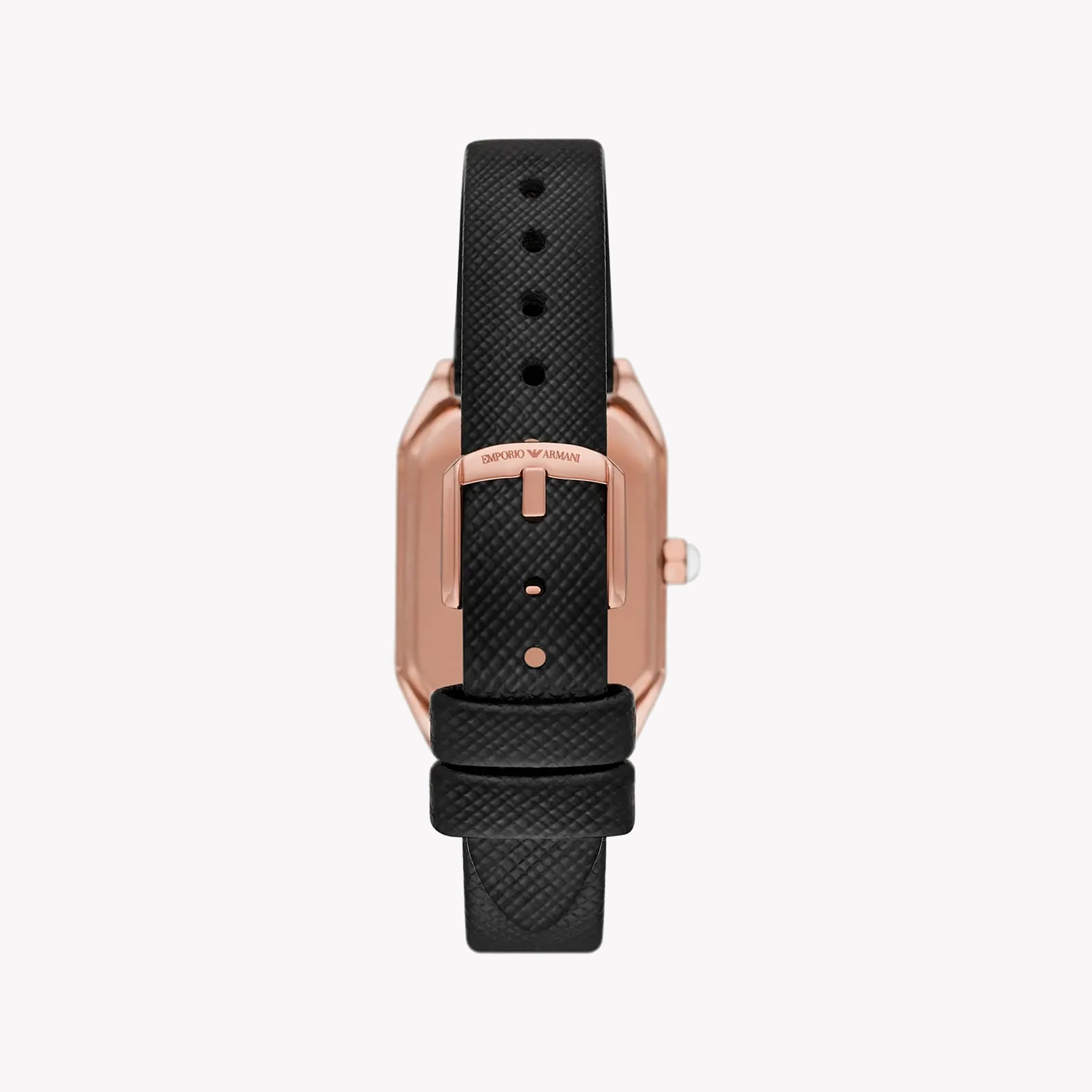 Kaufen Sie die Damenuhr Emporio Armani AR80068SET mit 24 mm großem roségoldenem Edelstahlgehäuse, Quarzwerk, schwarzem Lederarmband und 3 ATM Wasserdichtigkeit.