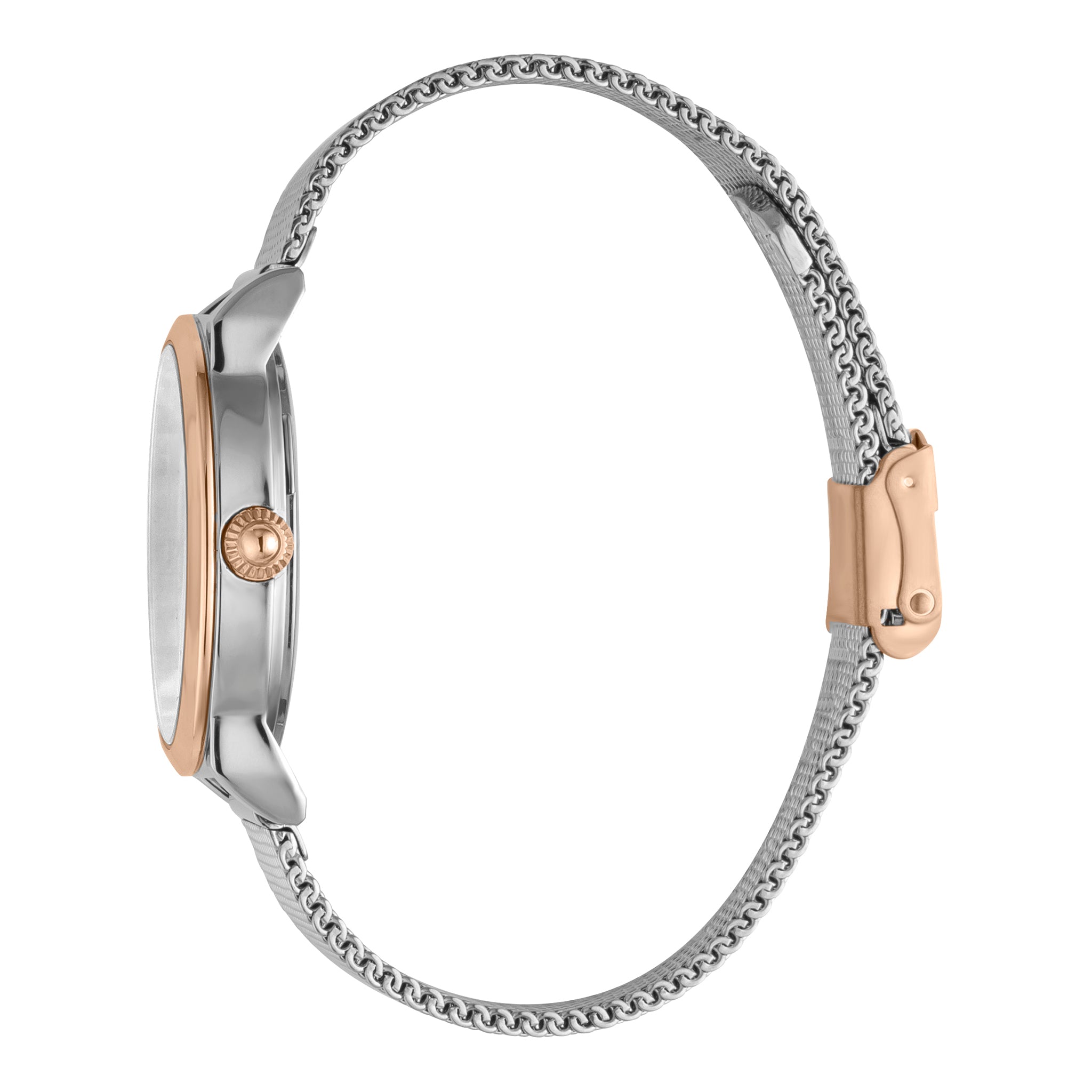 Zeitlos, raffiniert, elegant. Diese Damenuhr von Just Cavalli hat alles. Vom silbernen und roségoldenen Edelstahlarmband bis zum runden silbernen und roségoldenen Metallgehäuse mit 34 mm Durchmesser und natürlich dem eleganten silbernen Zifferblatt ist diese Uhr die perfekte Verkörperung höchster Raffinesse.