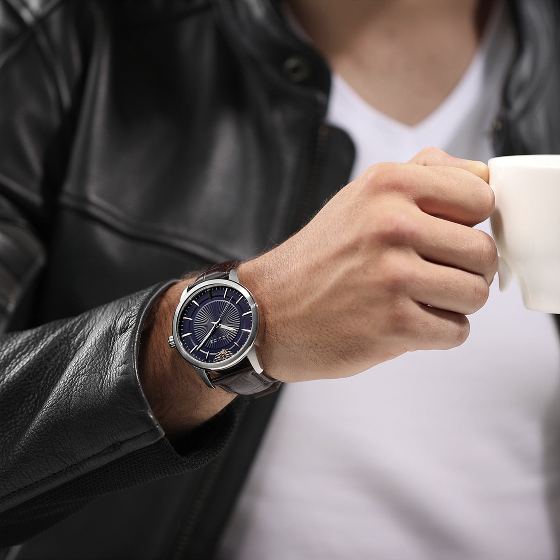 - Komfort und Stil: Das luxuriöse braune Lederband bietet nicht nur einen komfortablen Sitz, sondern verleiht auch einen Hauch von klassischer Eleganz, wodurch es sowohl für formelle als auch für legere Anlässe geeignet ist.