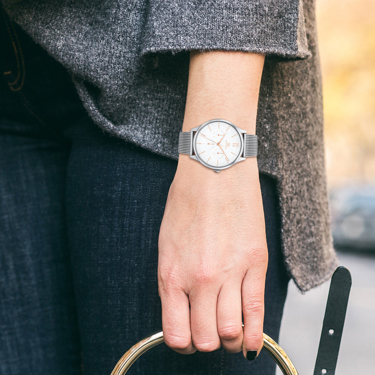 - Elegantes Design: Mit einem 38 mm Edelstahlgehäuse präsentiert sich diese Uhr in einem raffinierten Silberton, der harmonisch mit ihrer minimalistischen Ästhetik harmoniert.