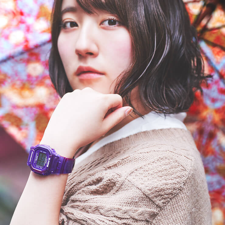 - Sportlicher Look: Die BGD-560S-6DR zeigt ein auffälliges lilanes Har Gehäuse und Band, das jedem Outfit eine verspielte Note verleiht.