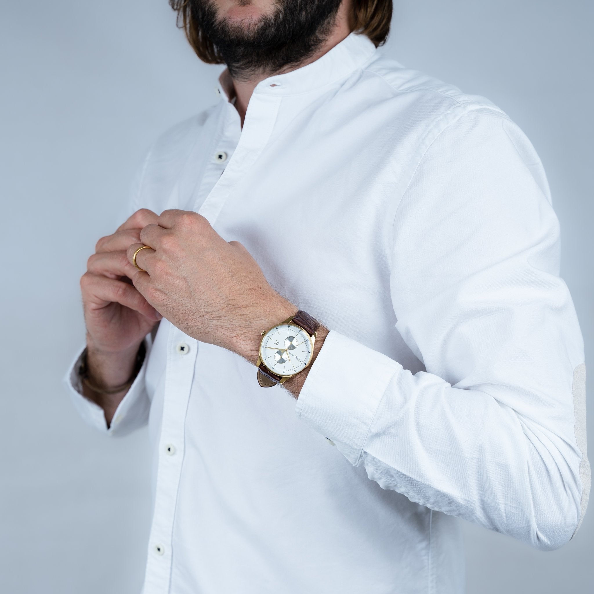 Eine stilvolle und luxuriös aussehende Uhr, die Pierre Cardin Uhr mit einem runden goldenen Metallgehäuse verfügt über ein braunes Lederband und ein weißes Zifferblatt. Mit einem Gehäusedurchmesser von 42 mm wird sie eine großartige Ergänzung für Ihr Outfit sein.