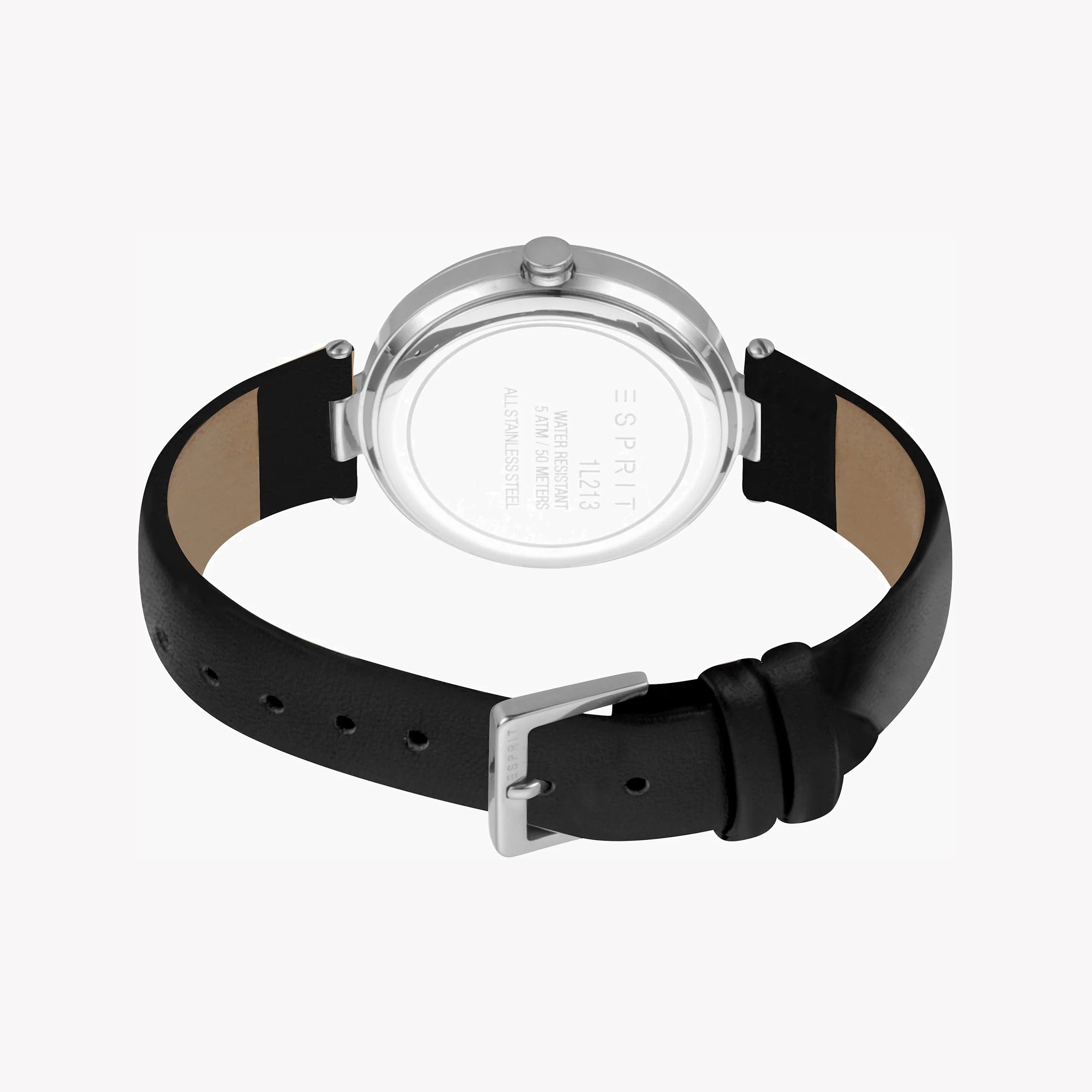 ESPRIT Damenuhr mit silbernem Edelstahlgehäuse und schwarzem Lederarmband