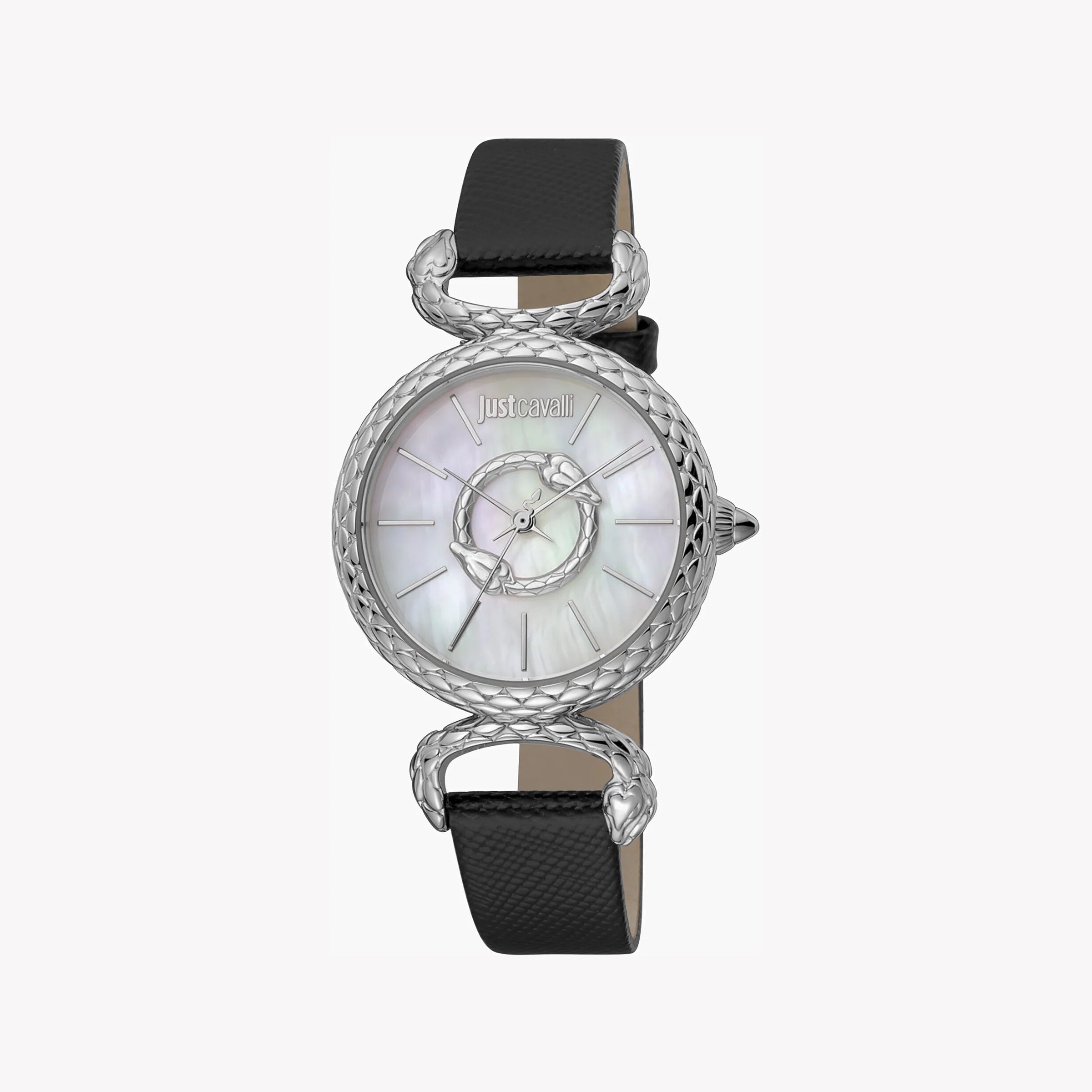 JUST CAVALLI Damenuhr mit silbernem Edelstahlgehäuse und schwarzem Lederarmband