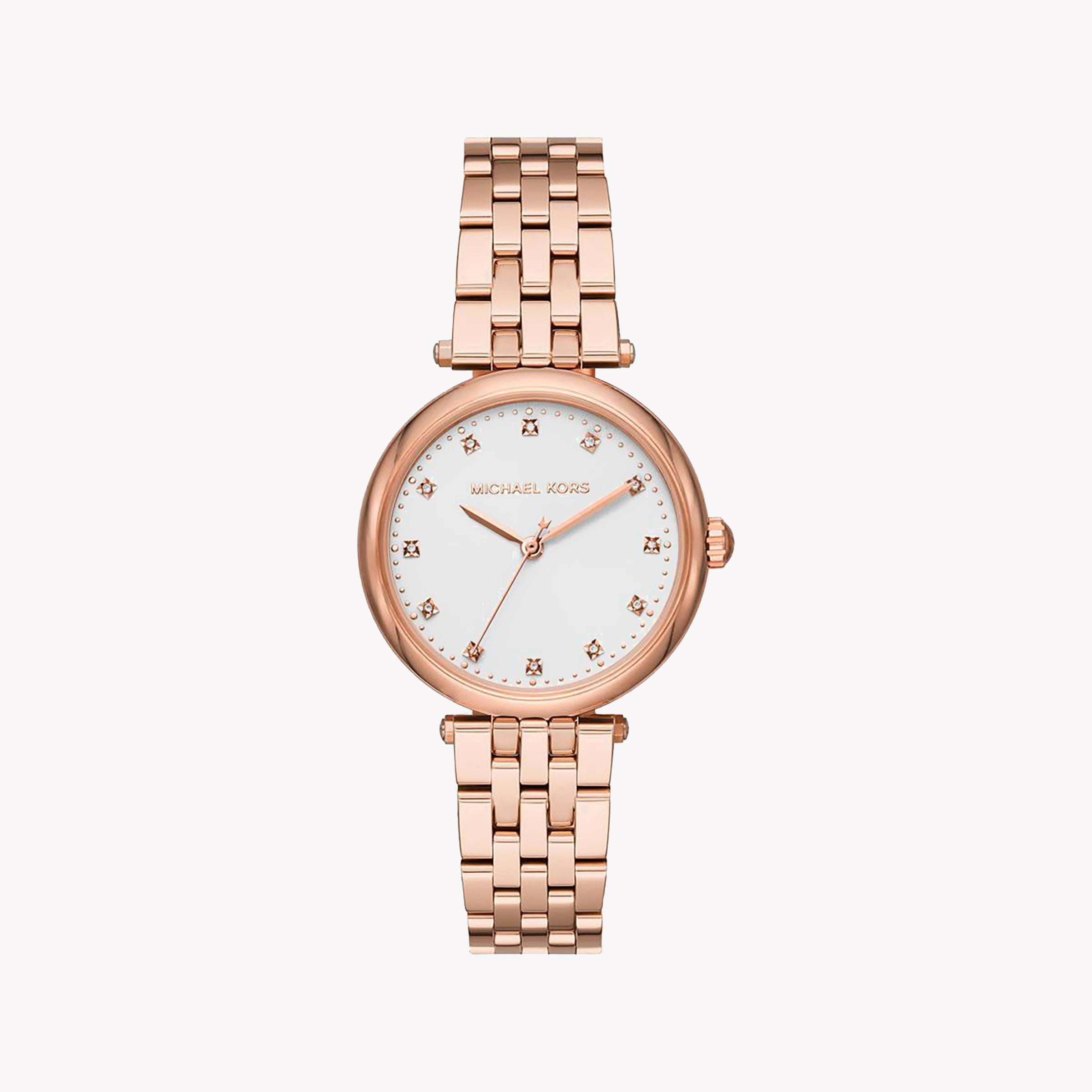 Kaufen Sie die Michael Kors MK4568 Damenuhr mit einem 34 mm großen roségoldfarbenen Edelstahlgehäuse, präzisem Analogwerk und stilvollem weißen Zifferblatt. Wasserdicht bis 5 ATM, perfekt für jeden Anlass!