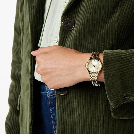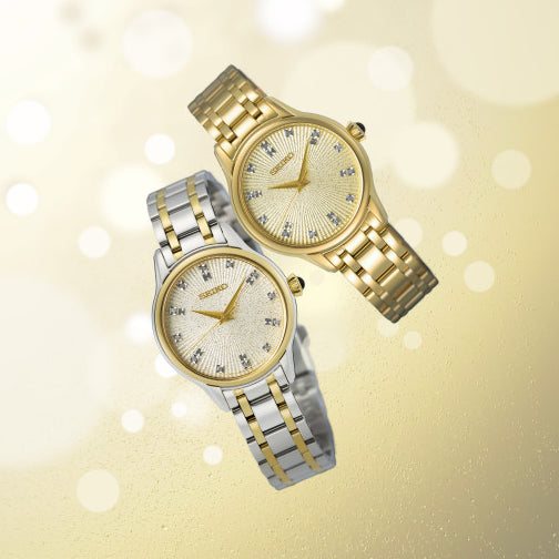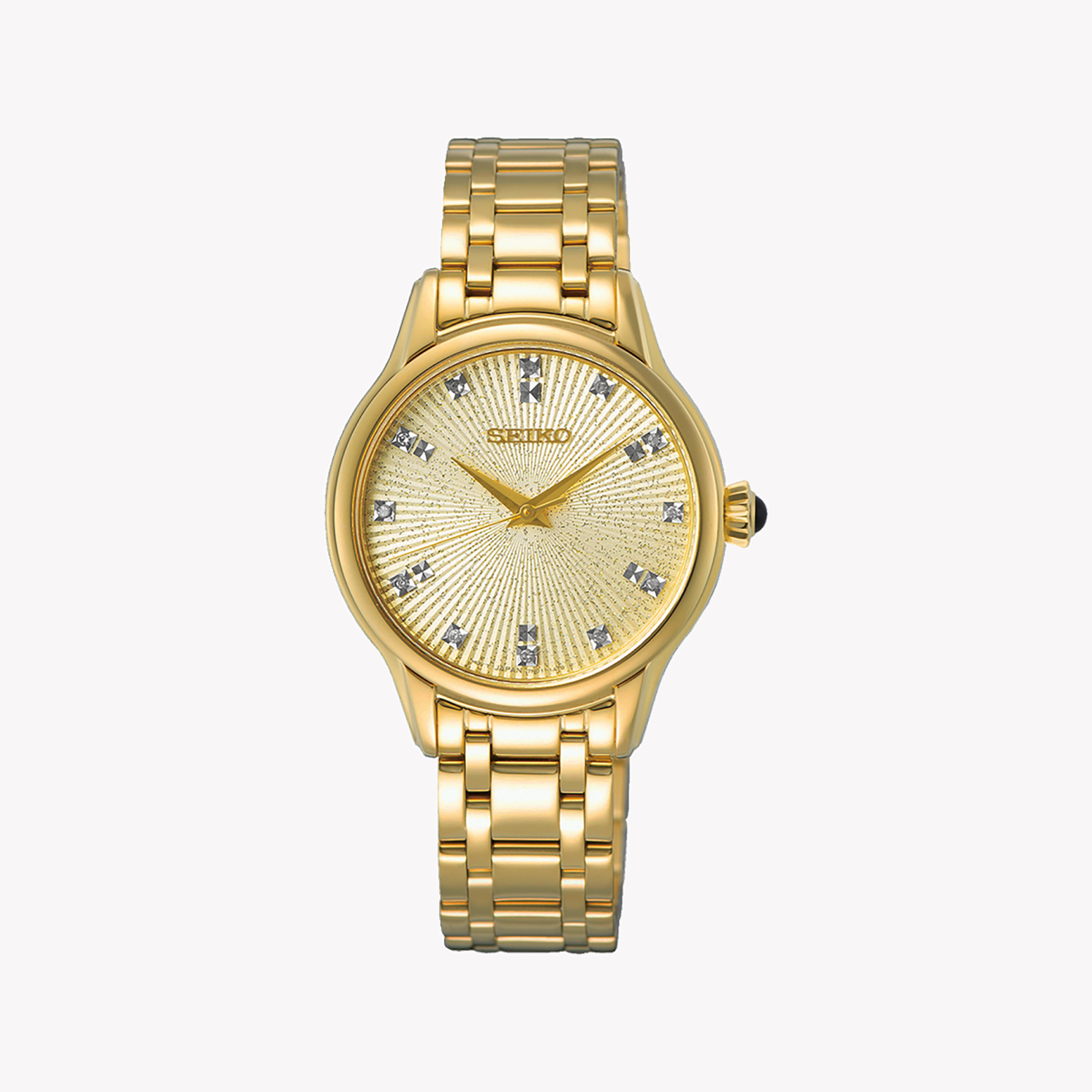 Exuding charm and elegance, the SEIKO SRZ552P1 is a stunning women's watch featuring a radiant gold stainless steel case and band. With a chic beige dial and reliable 5 ATM water resistance, this sophisticated timepiece is perfect for any occasion. Make a statement effortlessly!