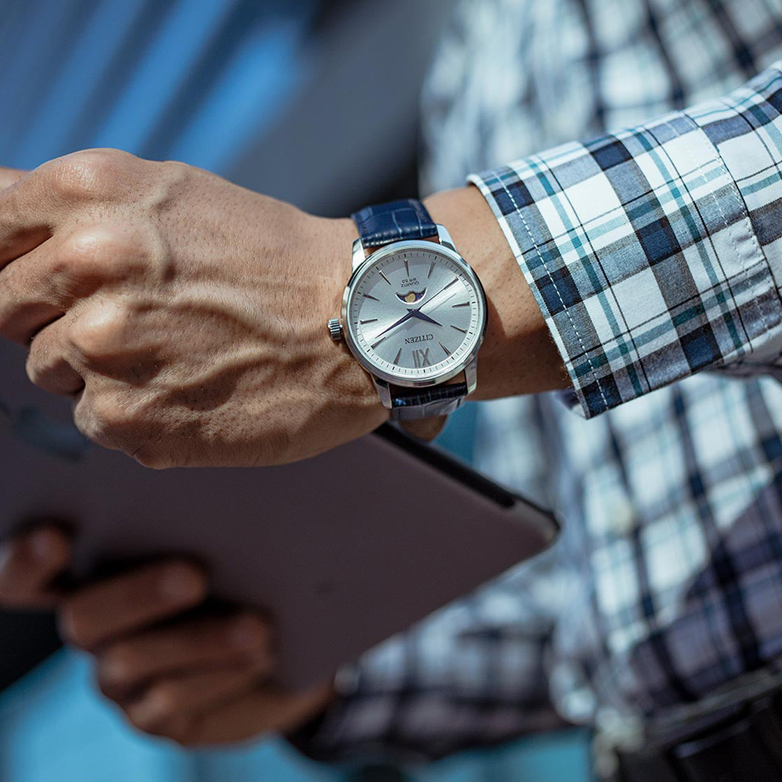 CITIZEN AK5000-03A STILVOLLE PRÄZISION – HERREN-MONDPHASENUHR AUS BLAUEM LEDER