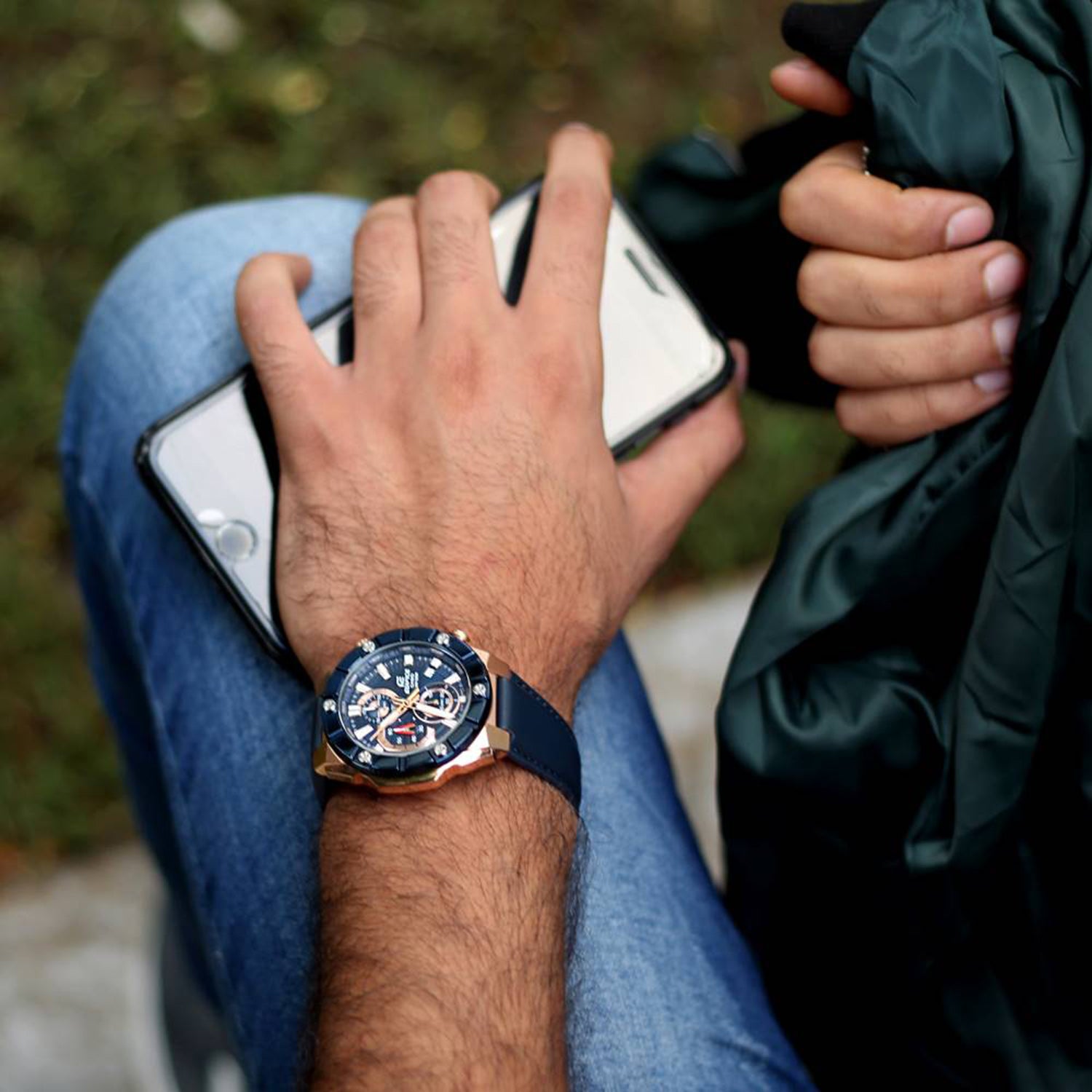 - Auffällige Ästhetik: Mit einem beeindruckenden Gehäuse aus Roségold, kombiniert mit einem eleganten grauen Lederband, wird diese Uhr garantiert Blicke auf sich ziehen und passt perfekt zu jedem Outfit.