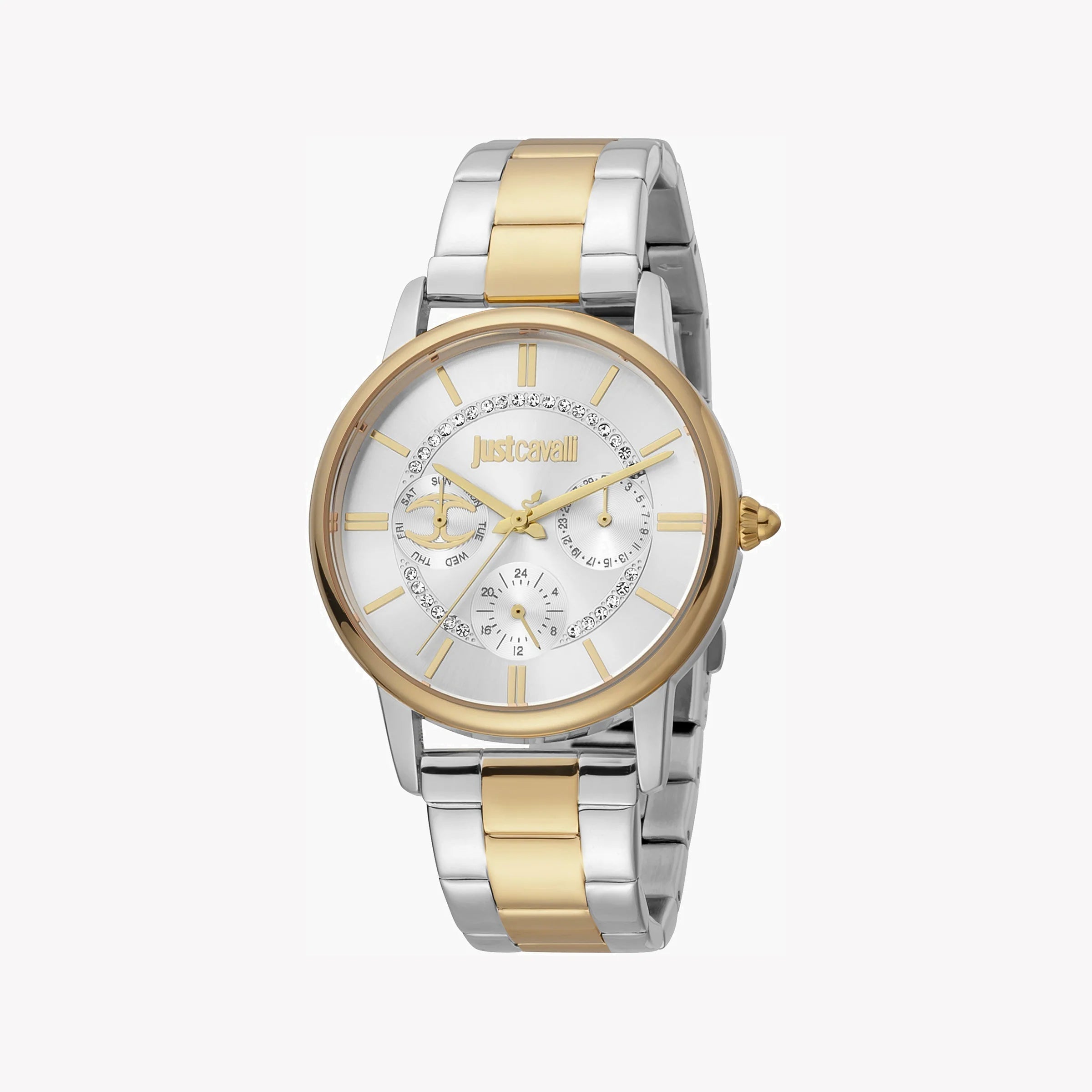 JUST CAVALLI Damenuhr mit Metall-Edelstahlgehäuse und silbernem und goldenem Edelstahlarmband