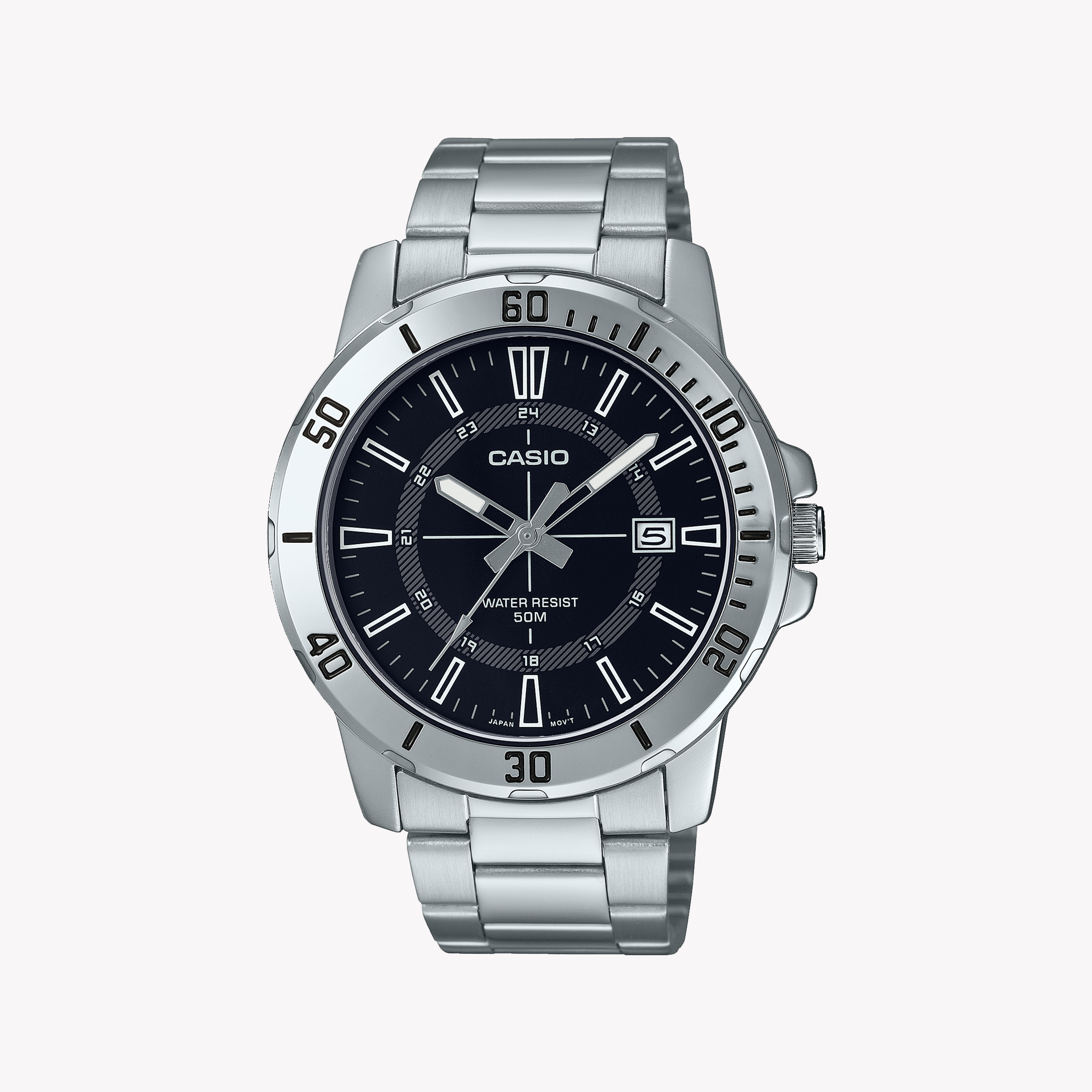 CASIO MTP-VD01D-1CVUDF SPORTLICHE ELEGANZ – HERREN-EDELSTAHLUHR mit schwarzem Zifferblatt und robustem Design