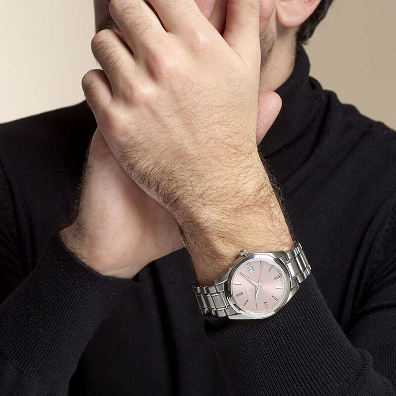 Seiko Men's Silver Stainless Steel Watch, Pink Dial | Sur523p1