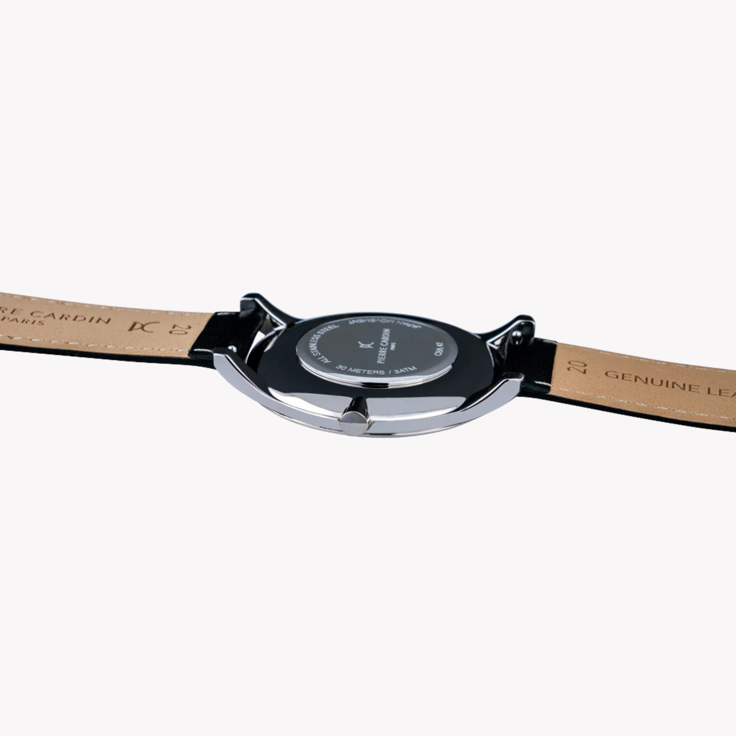 Eine stilvolle und luxuriös aussehende Uhr, die Pierre Cardin Uhr mit einem Gehäuse aus Edelstahl in Silber rund verfügt über ein schwarzes Lederarmband und ein schwarzes Zifferblatt. Sie hat einen Gehäusedurchmesser von 42 mm und wird eine großartige Ergänzung für Ihr Outfit sein.
