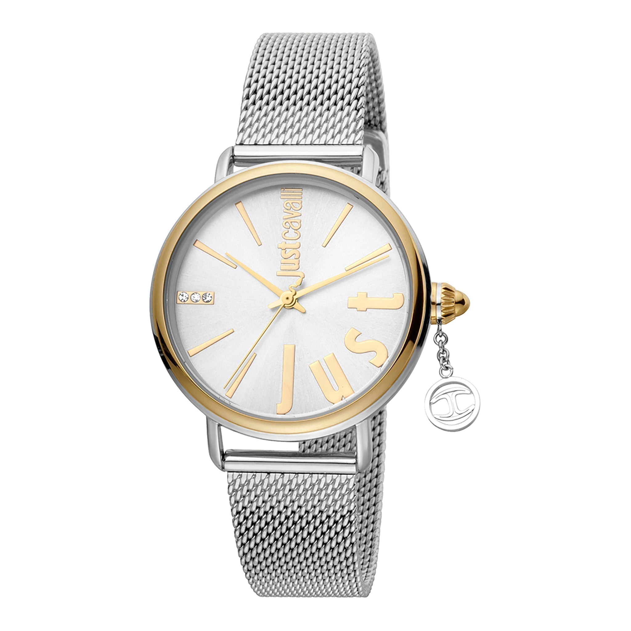 JUST CAVALLI Damenuhr mit silbernem Metallgehäuse und silbernem und goldenem Edelstahlarmband